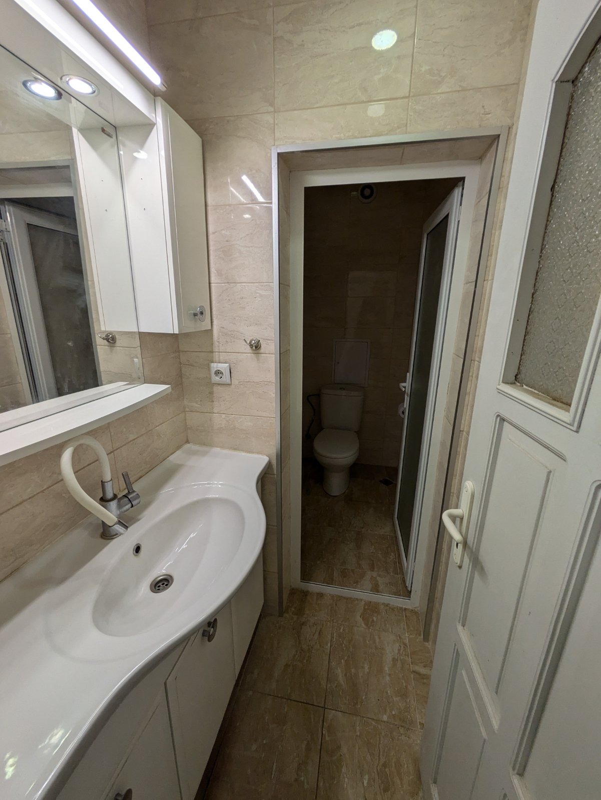 РАЗПРЕДЕЛЕНИЕ: голямо входно антре, просторен хол с кухня с голяма тераса на изток, баня, отделна тоалетна, две западни спани. С изба 10 кв.м. и земя към имота 60 кв.м..