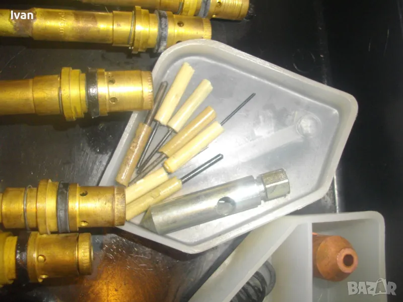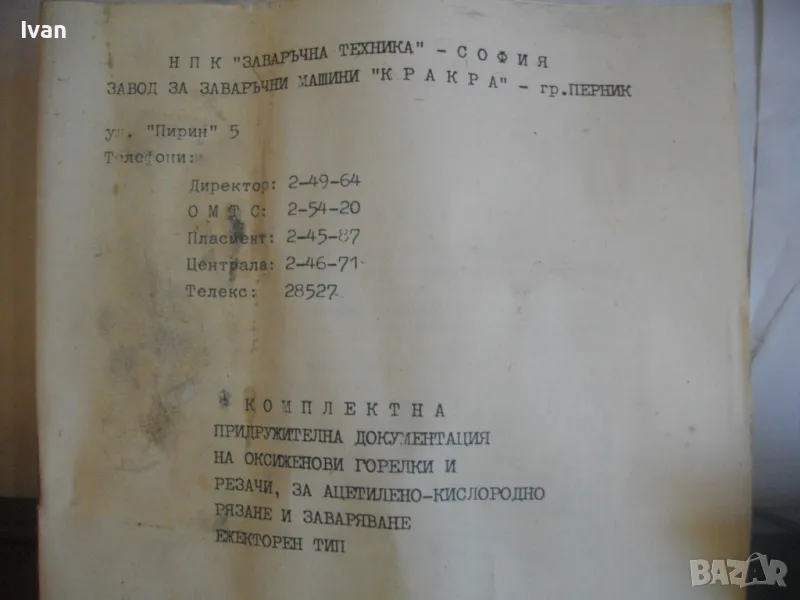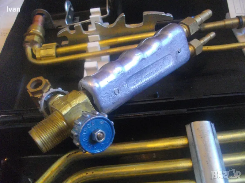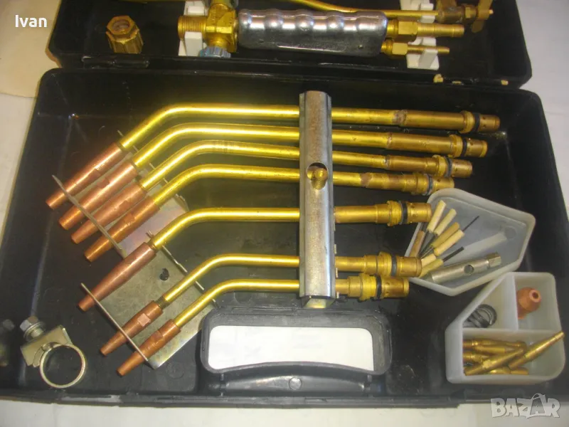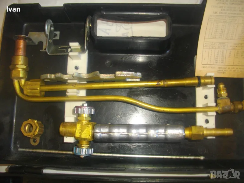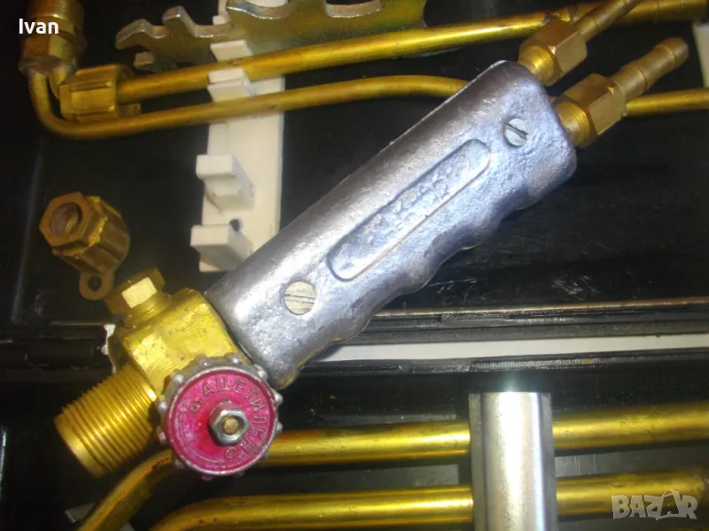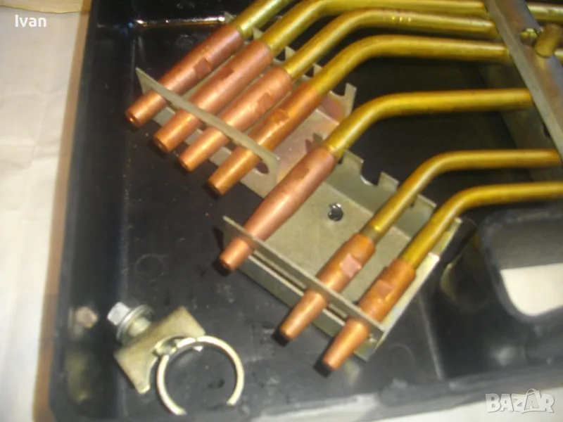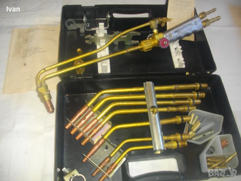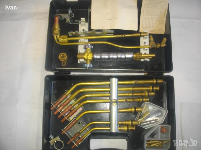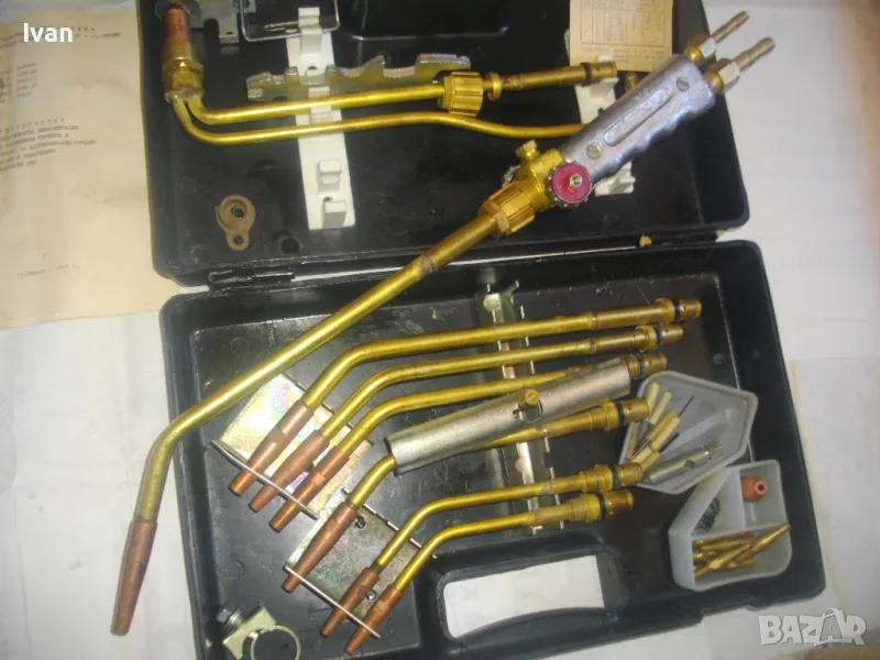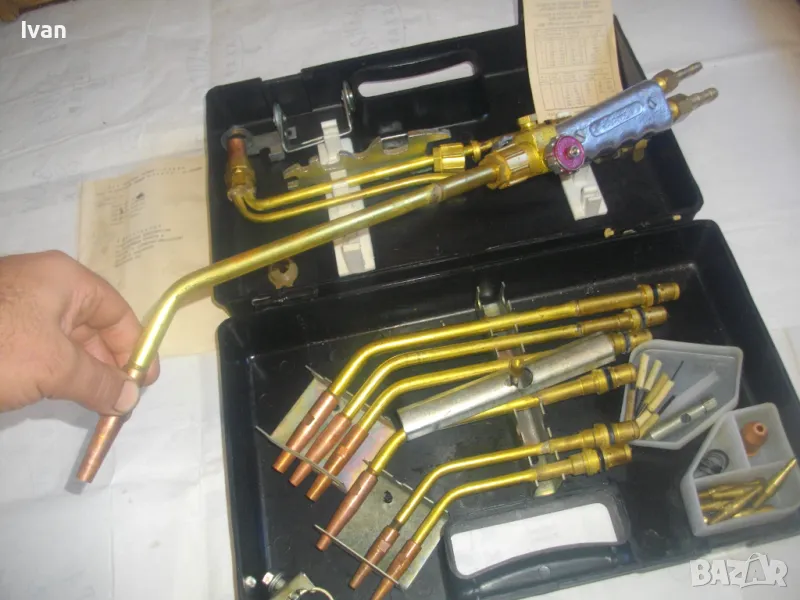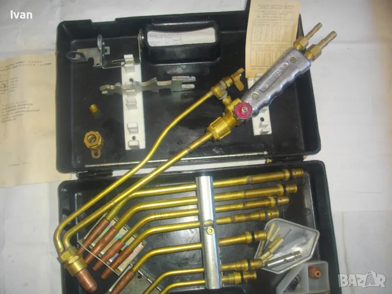 Цена на нов комплект КРАКРА резак и горелки в черен куфар - 699 лв. Старо висококачествено българско Соц производство. Пълен комплект, най-големият комплект от подобен тип на КРАКРА Перник. Производител НПК Заваръчна техника - София, Завод за заваръчни машини КРАКРА - гр.Перник. Наименование на комплекта по техн.документация: "Оксиженови горелки и резачи за ацетилено-кислородно рязане и заваряване ежекторен тип."Куфар оригинален черен пластмаса Изоплам, размери 375х245х100 мм. Съвсем нов комплект, неизползван и неупотребяван в отлично работно състояние и правилно съхраняван, без консервиране. Дръжка брнер с 2 въртока и 2 щуцера, рамо двутръбно резак със спирателна врътка и медна глава за дюзите, с поставена оригинална контактна бронзова дюза. 7 броя различни горелки от №0 до №7 рамена, с поставени на тях 7 бр. различни контактни оригинални медни дюзи за горелките от №0 до №7л В кутия в куфара са налични 1 медна глава за дюзите за резака, 6 гумени различни уплътнения за врътките на бренера 7 броя различни игли с дръжки за почистване на различните дюзи, 6 броя различни бронзови дюзи за резака. В куфара има още колесар, чертилка, броонзова гайка за рамената тръби на горелките, оригинален гаечен ключ за различните горелки и дюзи. Налична е техническата документация на комплекта - книжка указания и паспорт на комплекта. Според паспорота е произведен 1988 г. В книжката са представени техн.графики и скици на резака и горелките, указания за различните рамена и различните дюзи при различно рязане и заваряване на различните метали. Тегло на комплекта - 5,0 кг. Цена на комплекта в описания вид и състояние - 699 лв.
