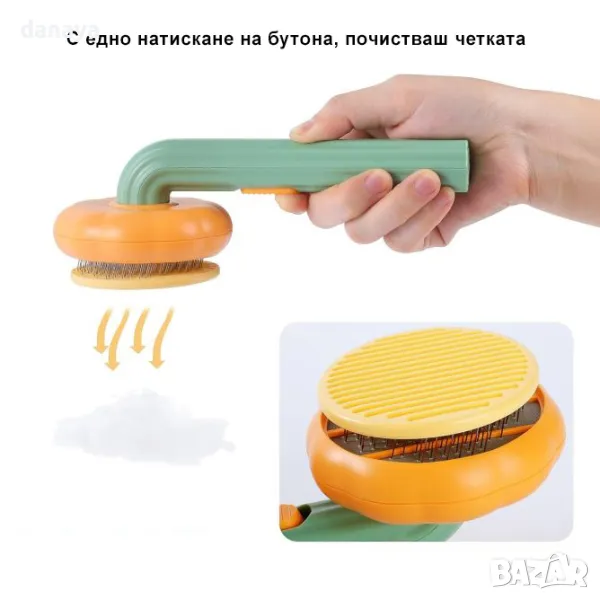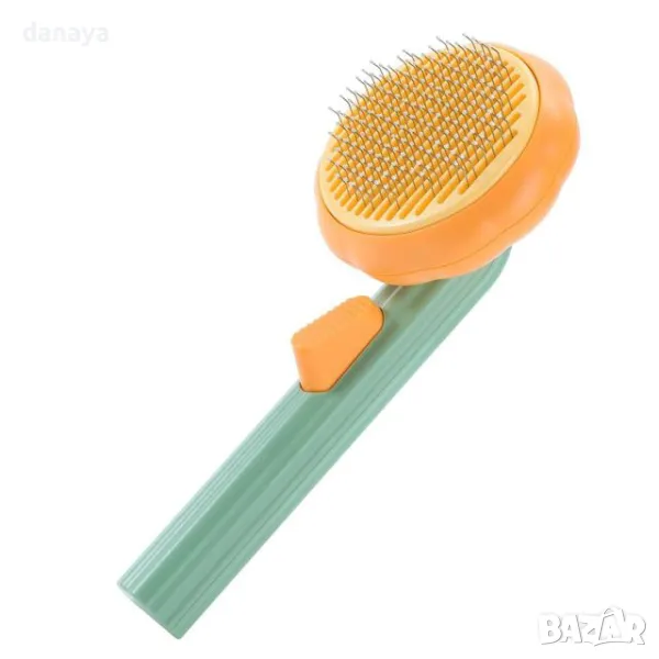 Тази четка за домашни любимци – котки, кучета и други домашни любимци като цяло е предназначена да направи грижата за козината на вашия домашен любимец лесно и приятно изживяване. С просто натискане на бутона за освобождаване косъмчетата се прибират в четката, което ви позволява лесно да премахнете натрупаните косми и да подготвите четката за по-късна употреба. Изработена от здрава ABS пластмаса и влакна от неръждаема стомана, тази четка е здрава и издръжлива, осигуряваща висококачествена грижа за козината на вашия домашен любимец. Кръглите мъниста в горната част на влакната предпазват чувствителната кожа на домашния любимец от надраскване, а дизайнът, вдъхновен от тиквата придава хубав и отличителен вид. Редовната употреба на тази четка може да подобри външния вид и здравето на козината на вашия домашен любимец, предотвратявайки появата на възли и бълхи и стимулирайки кръвообращението в кожата на всеки домашен любимец.
