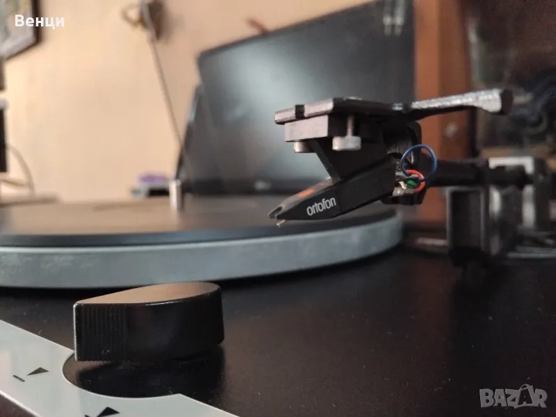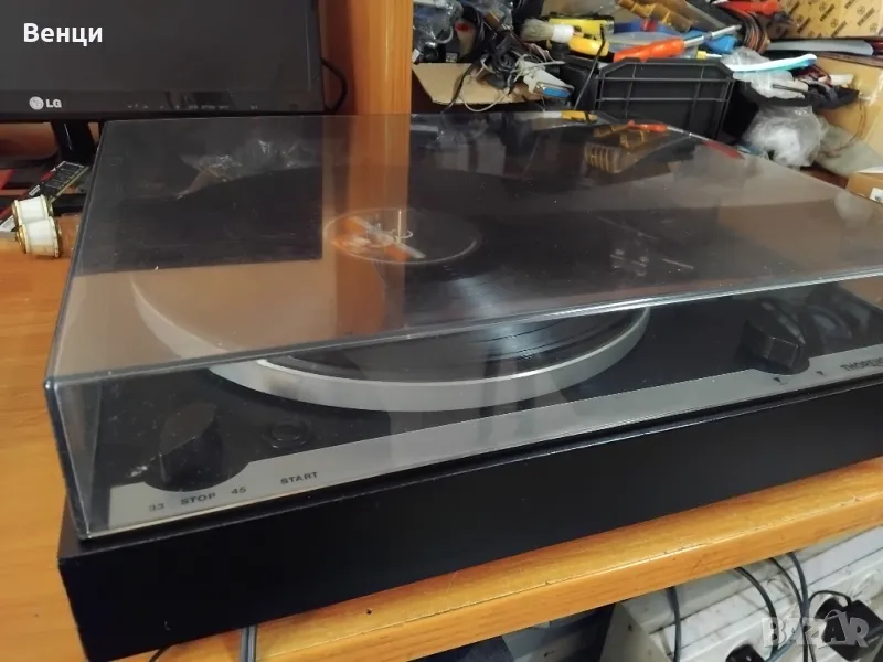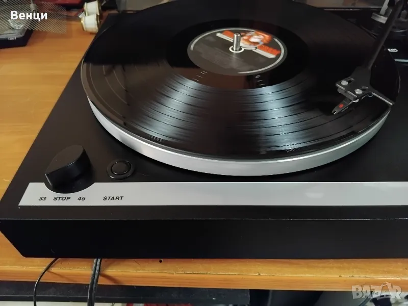 Качествен грамофон с ремъчно задвижване. Работи коректно, има много добър външен вид. Доза в много добро състояние. Капака има нормални следи от употреба, без дълбки драскотини. Оригинално захранване.