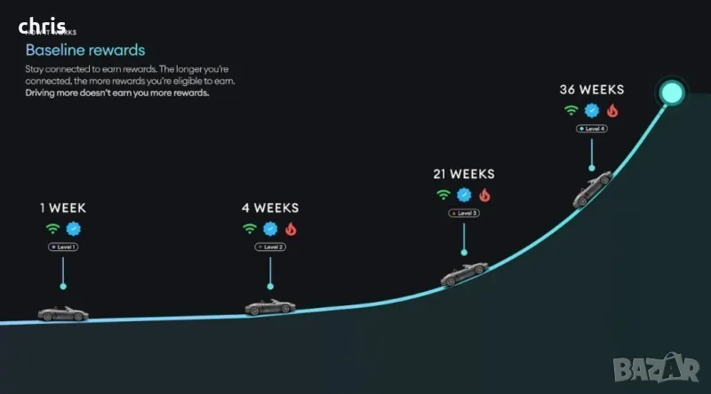 Колкото повече седмици е свързана колата, толкова повече награди има. Прикачил съм снимки с нивата и наградите. Всяка седмица е нужно само за малко са се свърже, за да отчете активност - не се плаща повече за повече време online.