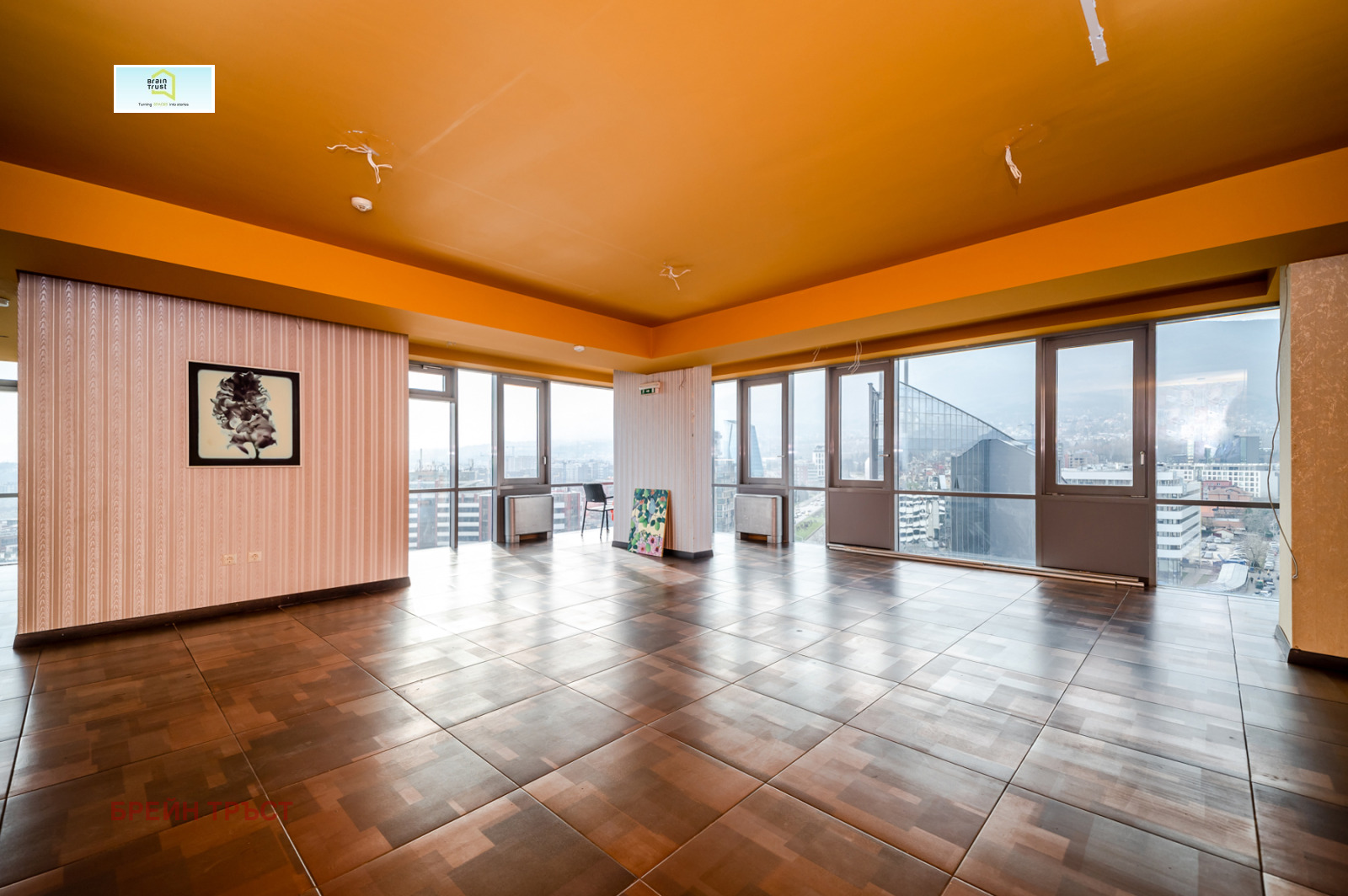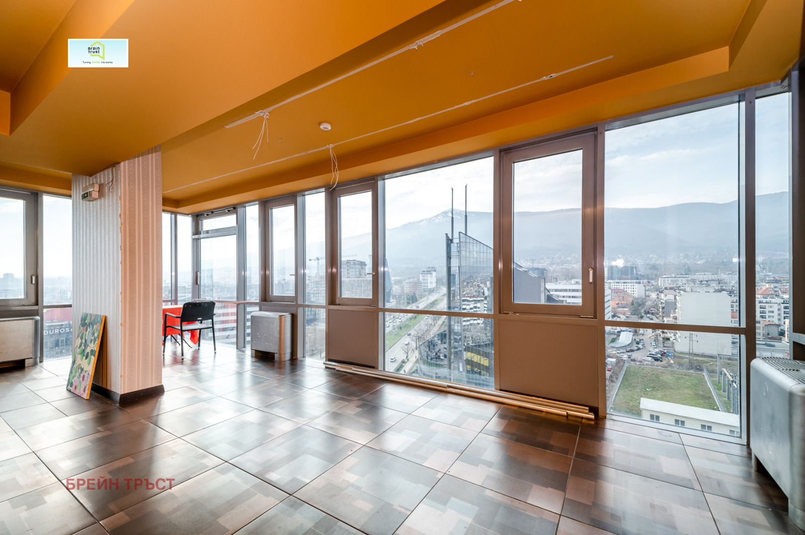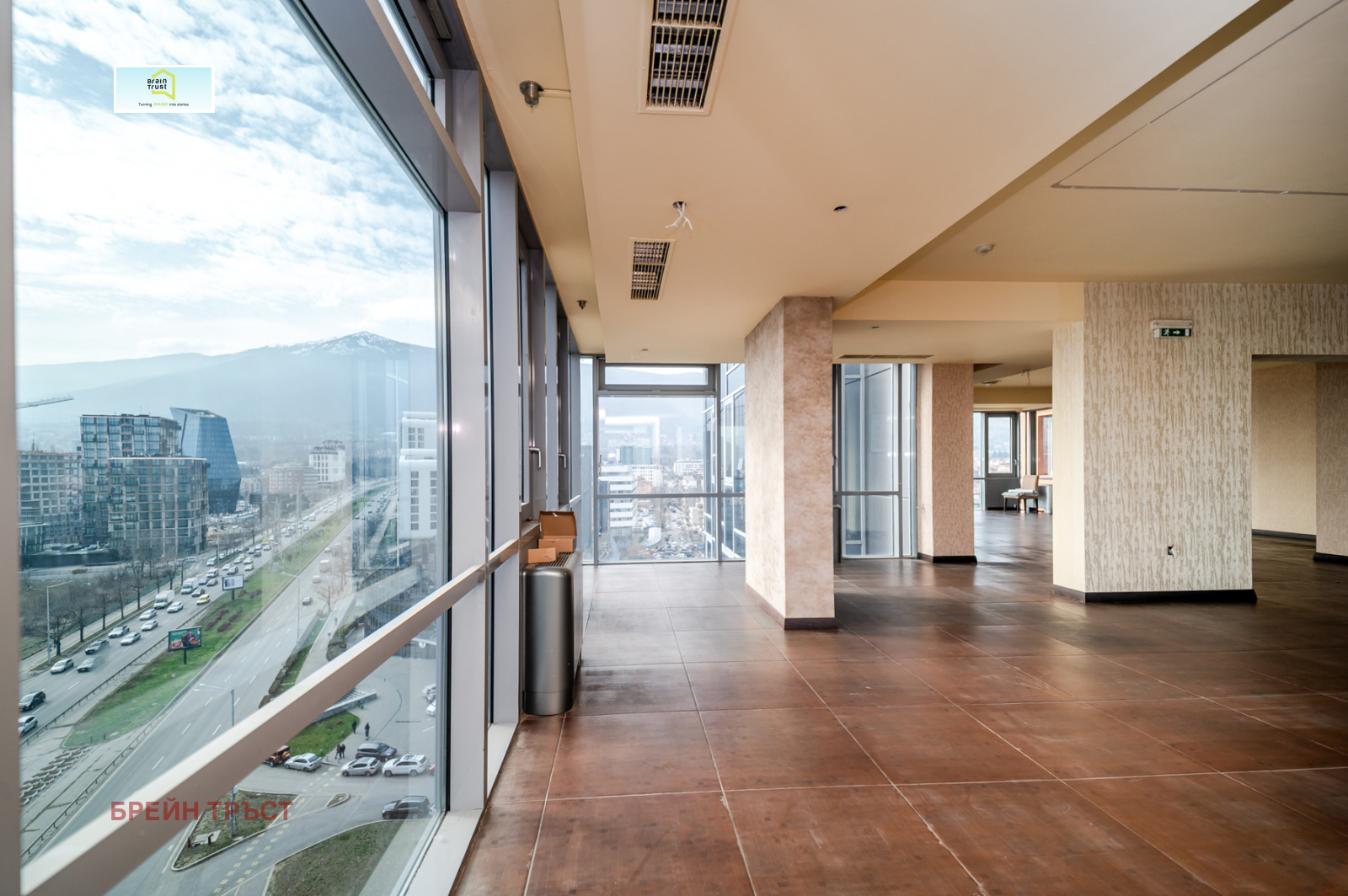 Имотът е разположен на 12-ти и 13-ти етаж в луксозна бизнес сграда, разполага с чиста площ от 519 кв.м и огромна панорамна тераса с площ от 340 кв.м. От френските прозорци се откриват прекрасни гледки към Витоша планина. Помещенията са просторни и светли, асансьорът води директно до имота.