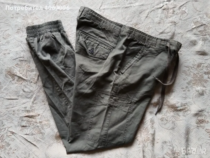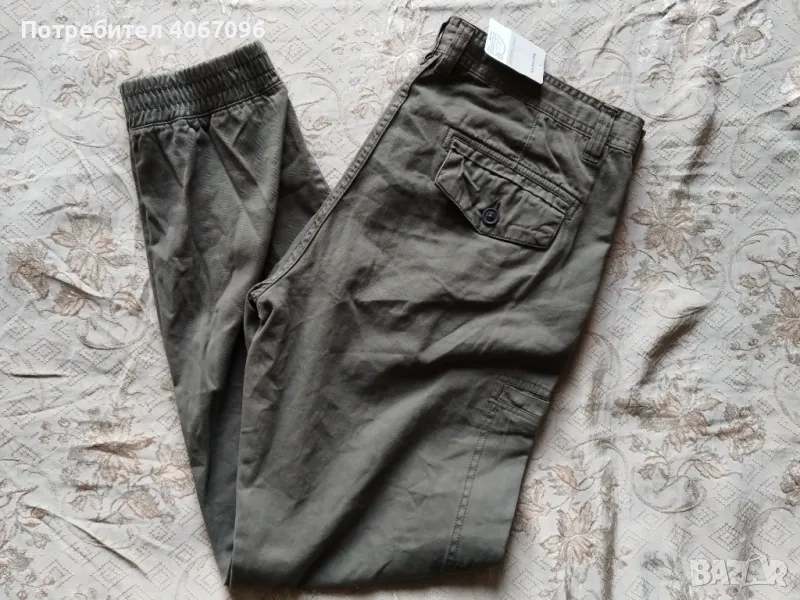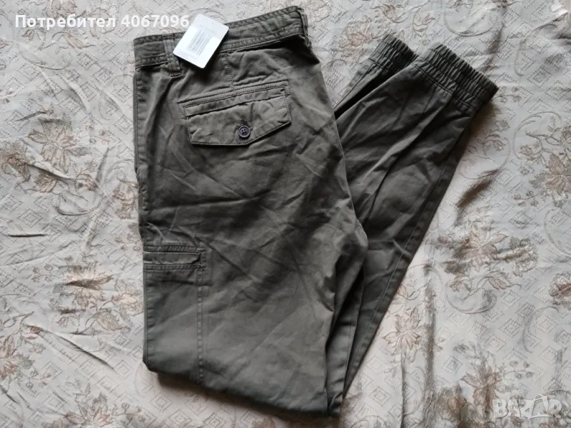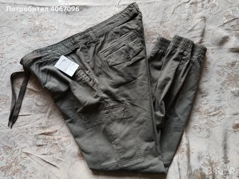 Карго панталон Watson's - cargo. НОВ с ЕТИКЕТ. 100% памук. Зелен – олив. Общо 6 джоба. Допълнителни връзки на колана, широк ластик долу на крачолите. Размер по етикет – 52. Размери: талия – 100 см., крачоли: външна дължина – 111 см., вътрешна – 86 см. Цена – 25 евро. (не подлежи на коментар).