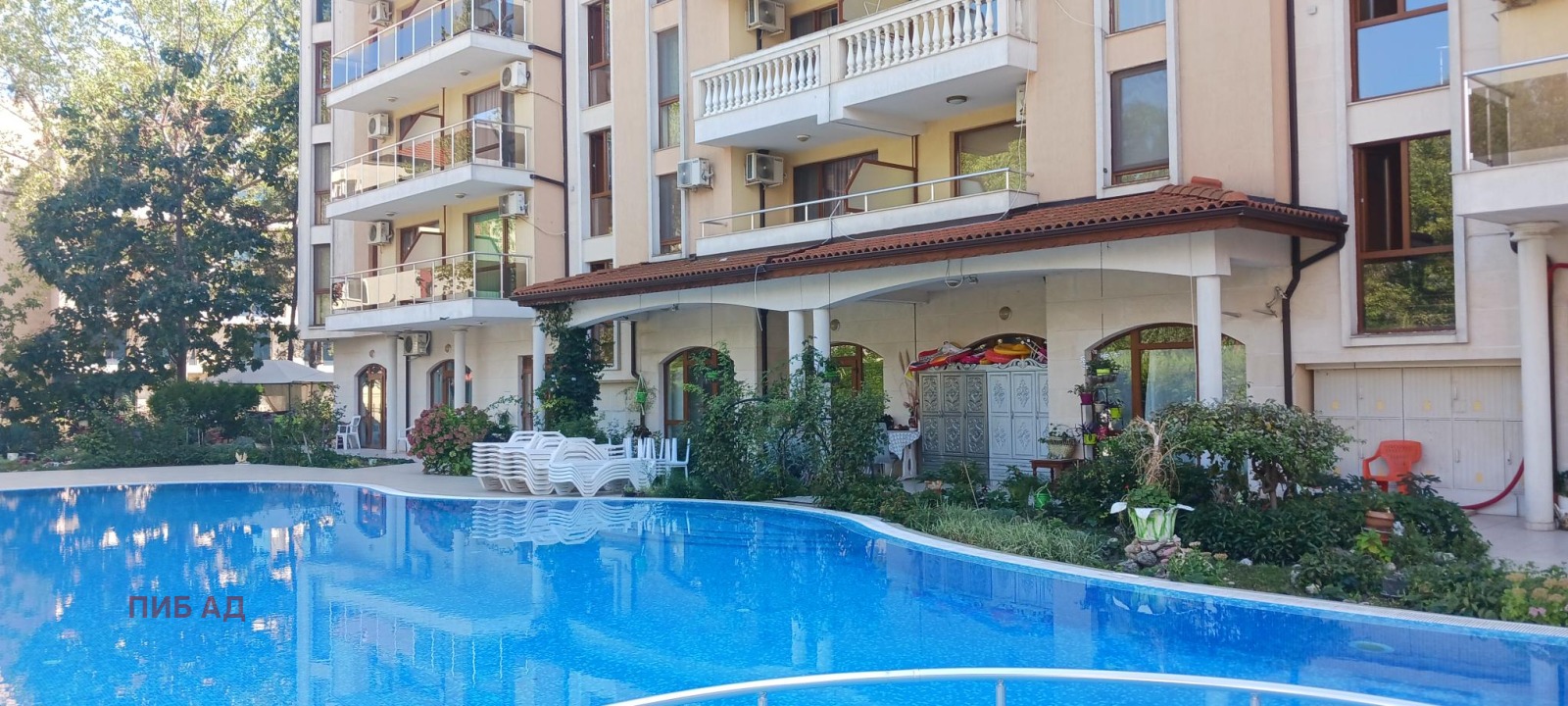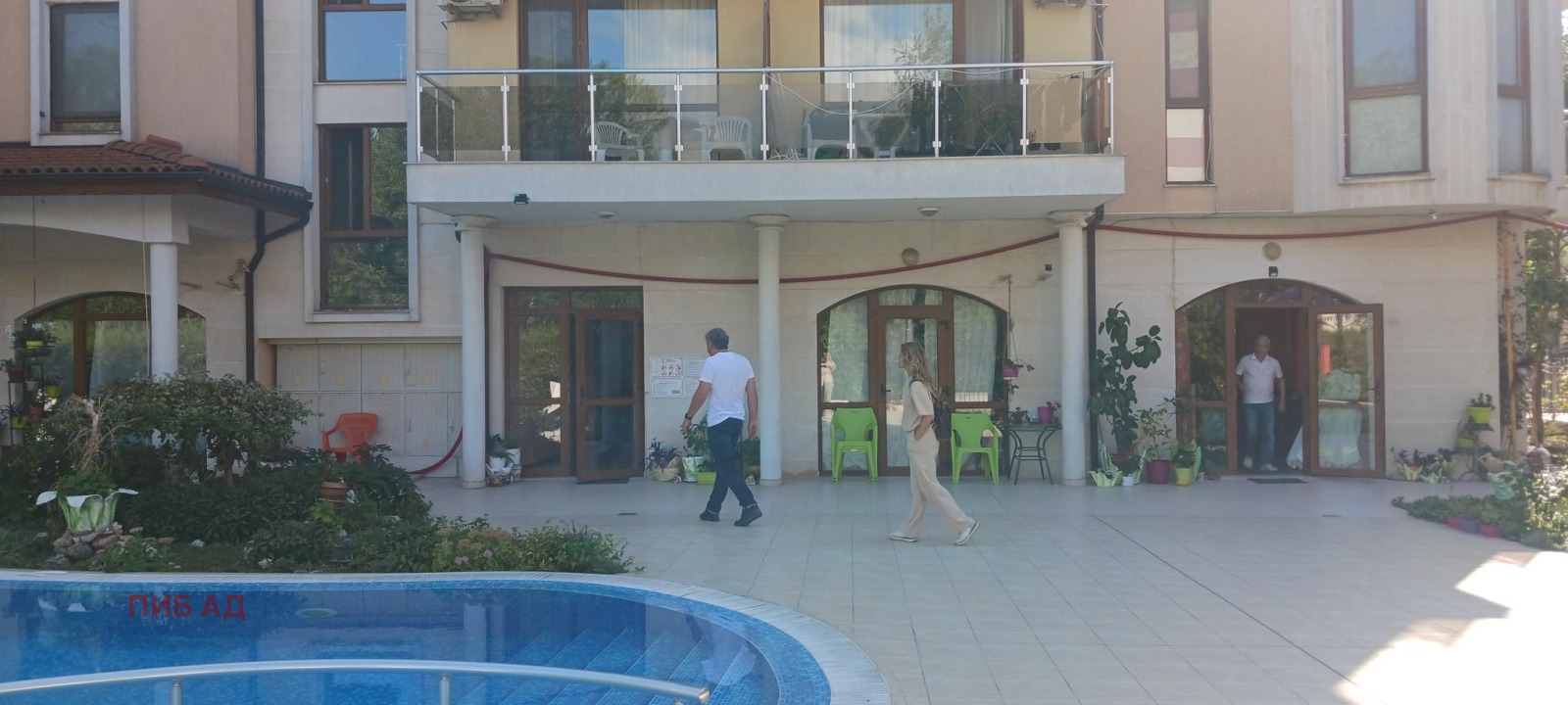 Помещенията са с отделни входове в жилищна сграда с двор и басейн.