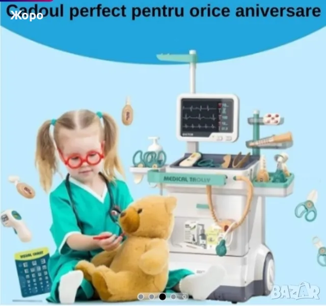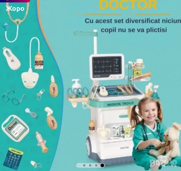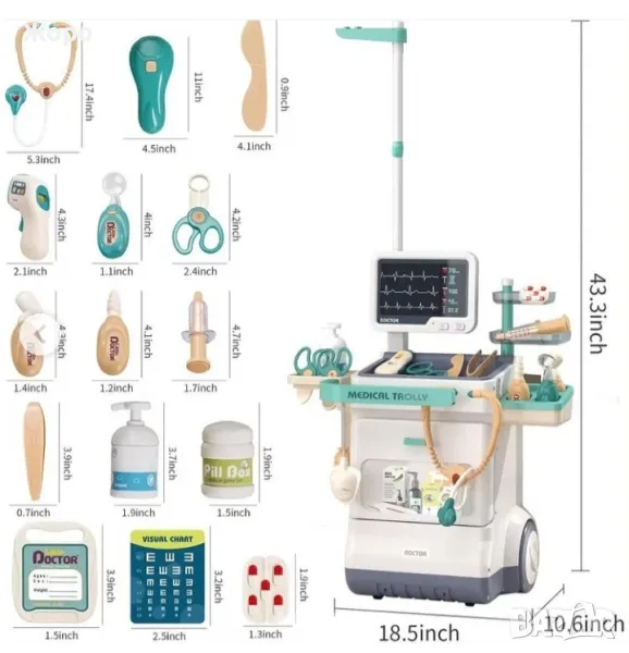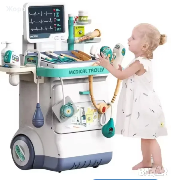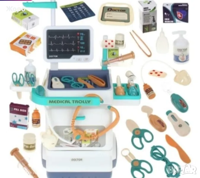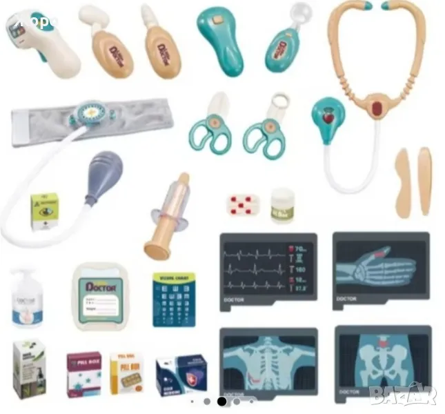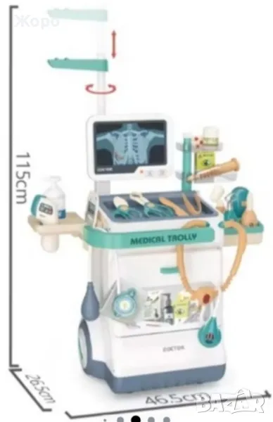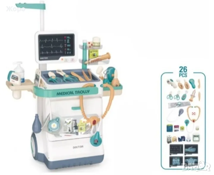 Лекарски детски комплект със скенер , с медицинска количка,от 26 части, със реалистични звуци, включва рентгенови лъчи, стетоскоп, термометър, спринцовка,и много други копие на истински медицински инструменти , които ще накарат едно дете да се почувства истински лекар преносим, стимулира въображението