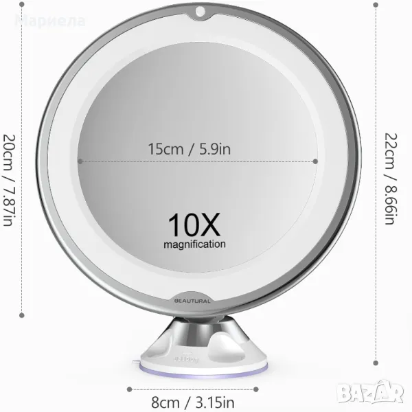 BEAUTURAL 10X увеличително огледало за грим със светлини, осветено увеличително огледало с вендуза