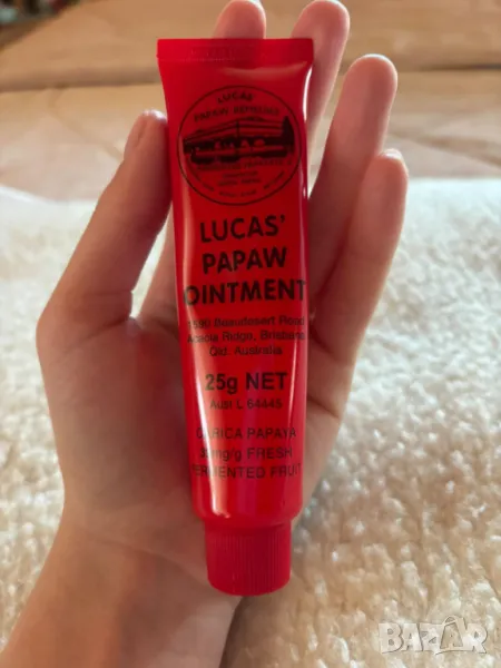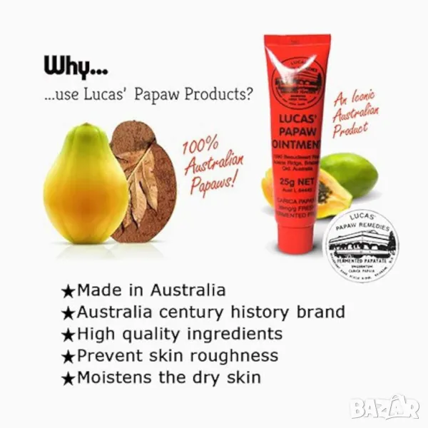 Информация за продукта Lucas Papaw Ointment може да се използва като локално локално приложение при следните. * Абсцеси * Циреи * Синини * Изгаряния * Карбункули * Протривания * Порязвания * Кисти * Суха и напукана кожа на ръцете и краката * Обрив от чакъл * Топлинен обрив * Ужилвания от насекоми * Ухапвания от комари * Отворени рани * Пъпки * Попарвания Слънчево изгаряне * Подуване, свързано с нараняване * Трески и шипове * Tinea * Whitlow Също така: ✓ Обрив от пелена и напукани зърна ✓ Временно облекчаване на симптомите на дерматит и екзема ✓ Временно облекчаване на дискомфорта от хемороиди чрез локално приложение. Папая или папая всички познаваме като вкусен плод, но полезните качества на папаята много помагат на кожата. Lucas Paw paw Ointment се произвежда в Австралия от чиста лапа. Мехлемът Lucas Papaw почиства инфекциозните отпадъци. Papaw съдържа папаин, който помага за почистване на рани. Основата, използвана в мехлема Lucas Papaw, е сертифицирана като свободна от канцерогени. Мехлемът е одобрен от Австралийската правителствена администрация за терапевтични стоки .