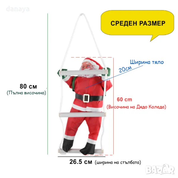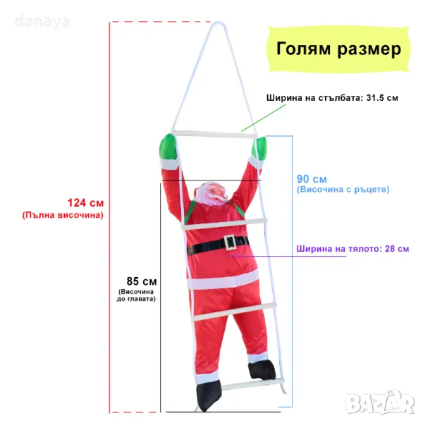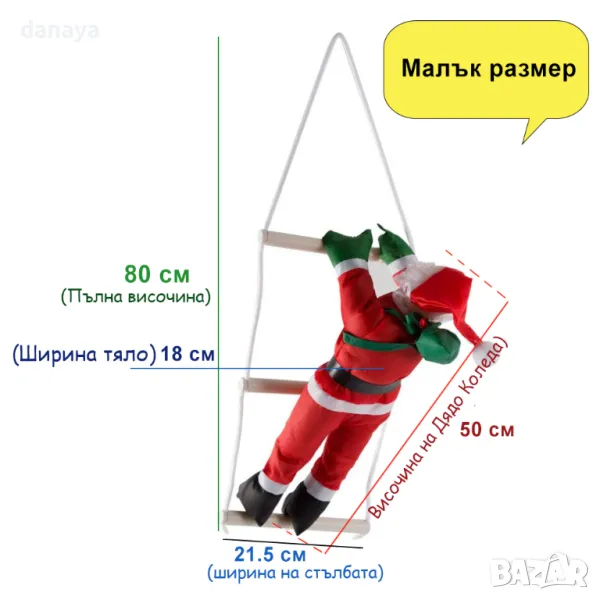Катерещ се Дядо Коледа на стълба – чудесен коледен декор за дома. Коледна декорация подходяща за окачване на балкони и тераси, къщи. Играчката представлява кукла с форма на любимия старец Дядо Коледа, който се изкачва по стълба, за да донесе подаръци на децата.