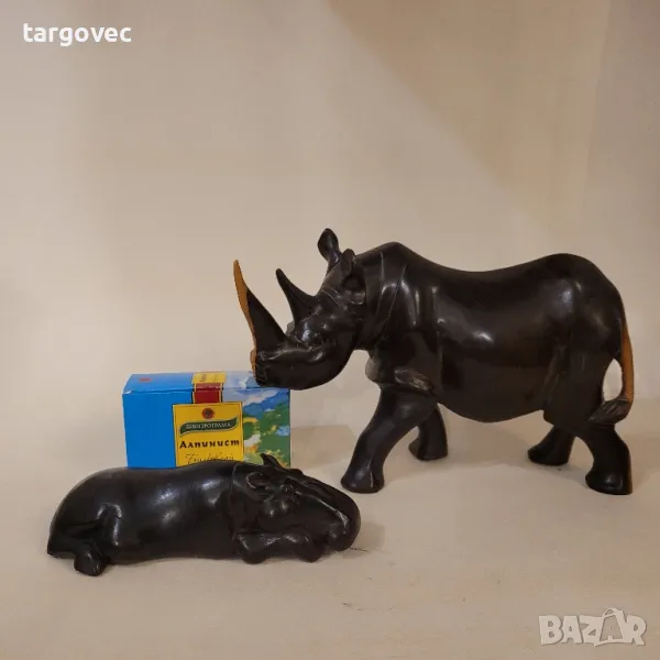 комплект от два броя фигури като носорогът е с височина 19 см и дължина 30 см а хипопотамът е с дължина 20 см и височина 5 см и половина кутията от чай не се продава и е на снимката за да придобиете реалната представа за размера носорога е продаден хипопотана 60лв