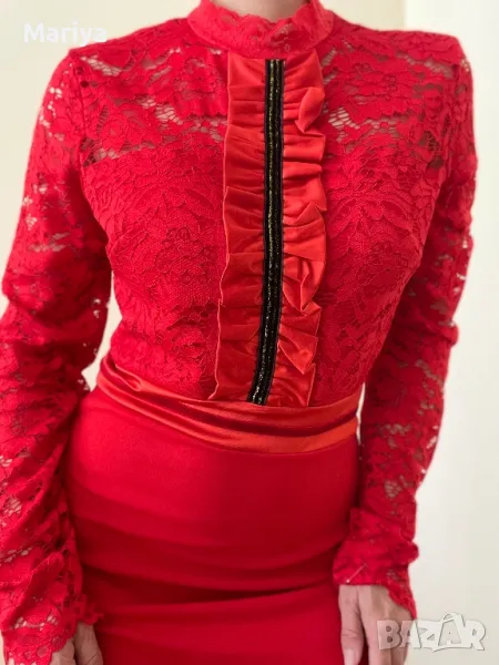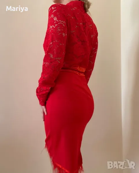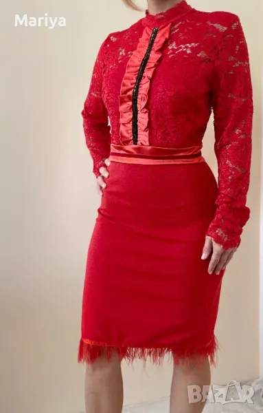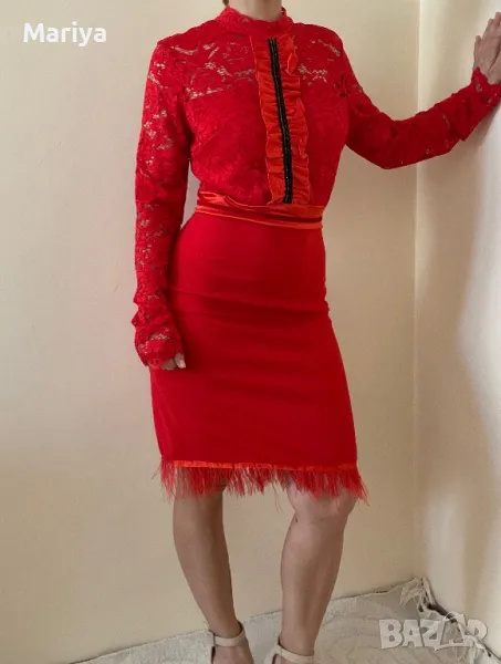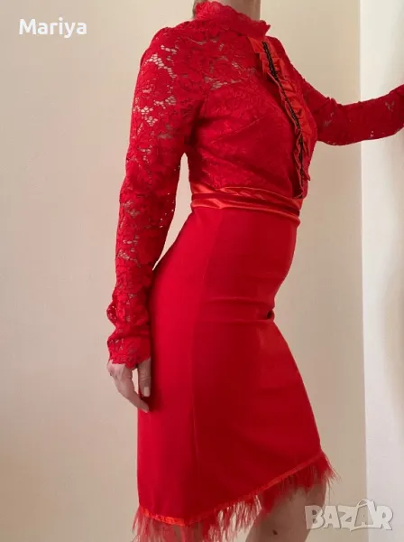 Стилна червена рокля с дантела и пера. Размер С и М → Обява 47681636