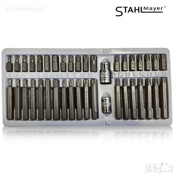 Комплект битове-накрайници STAHLMAYER SM4401 се състои от 40 броя качествени елементи от -S2 стомана. Включва битове от типа Hex, XZN и Torx, както и два държача 1/2" и 3/8". Комплектът се съхранява в здрава метална кутия.