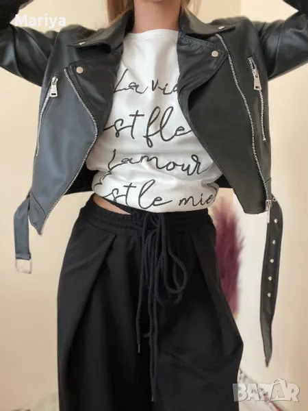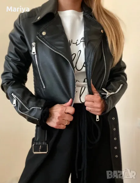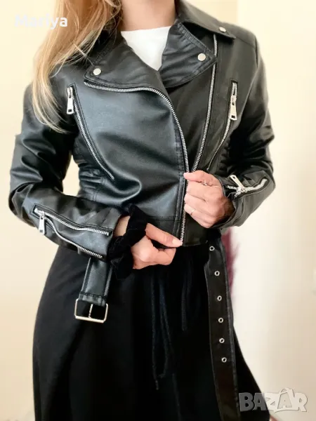 Висококачествено кожено яке в черен цвят с коланче. Размери С и Л