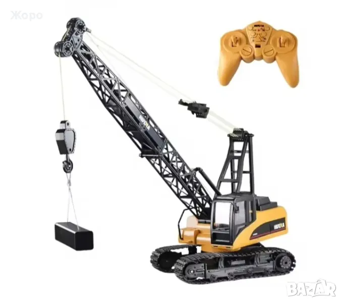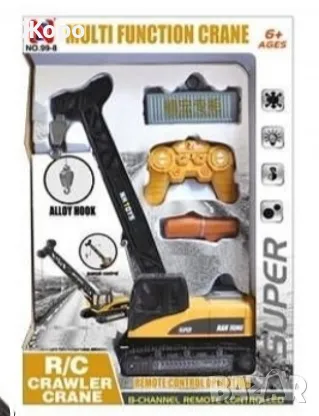 Комплектът съдържа:- верижен кран,- дистанционно управление,Функции:- движение напред и назад и встрани ,надясно и наляво със завиване,- движение на стрелата нагоре и надолу (повдигане и сваляне на товари),- въртяща се на 360° кабина,- светлинни ефекти,- звуци на запалване на двигател,- звуци на работещ двигател,- реалистични звуци при движение на стрелата,Височина на стрелата - 42 см.Заредете дистанционното управление с 2 батерии от 1.5 V size AA.За деца над 3 годин
