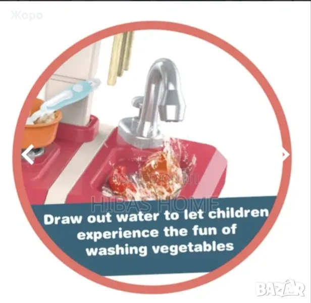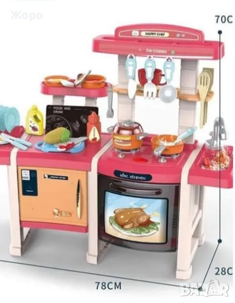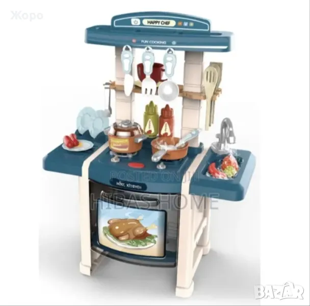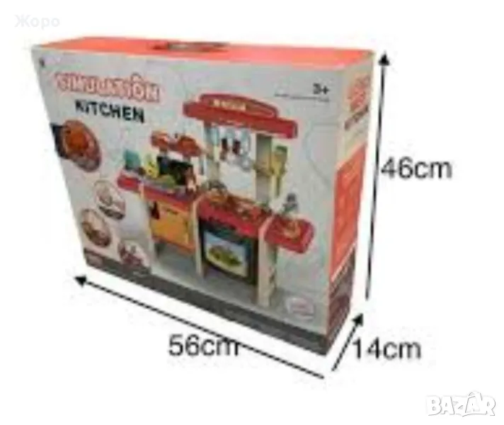 Детска кухня с течаща вода, пара и течаща вода от 33 части кухненски прибори , тигани тенджери и други аксисоари необходими за да осигуряват дълги и забавни часове игра., подходяща за деца над 3 години.