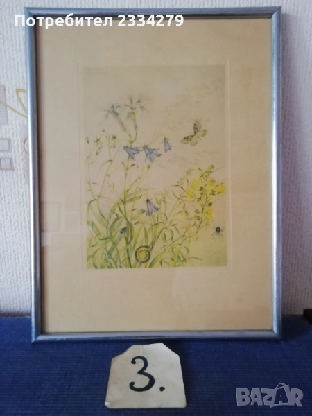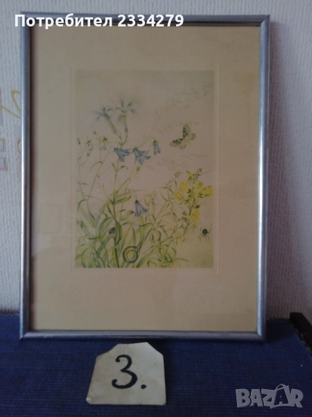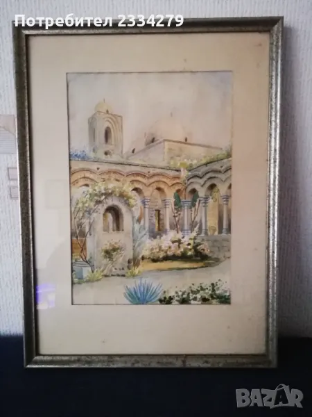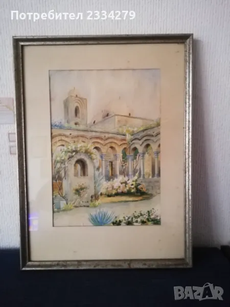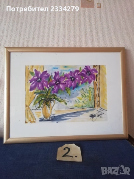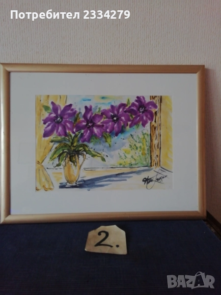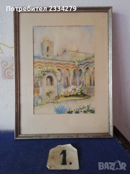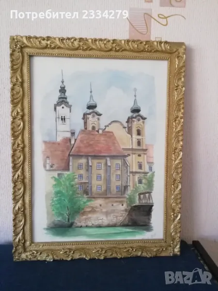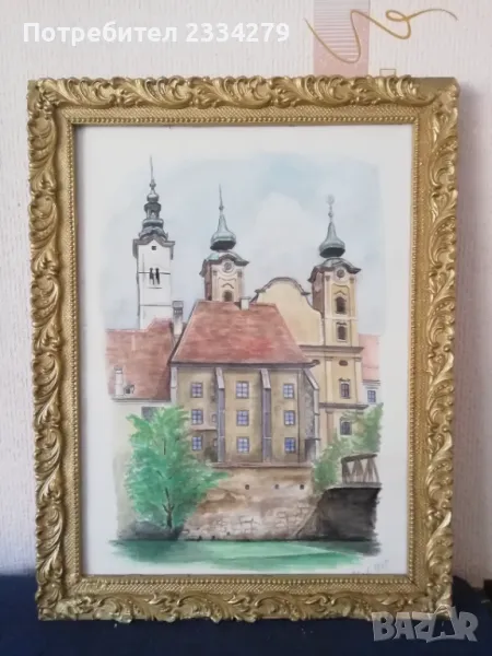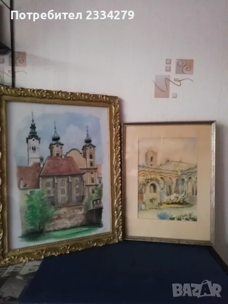 N:1 авторска картина ръчно рисувана, акварел с автограф и 1985год.,поставена в орнаментирана дървена рамка в бароков стил с размери: 47х35см.,цена 20лв.; N:2 австрийски автор картина рисувана ръчно с акварелни бои, има автограф, размери 43х33см., цена 10лв.; N:3 картина акварел сразмери 37х29см., цена 10лв. N:4 Стара русунка акварел в остъклена дървена рамка с размери: 38х29см.,цена 20лв.