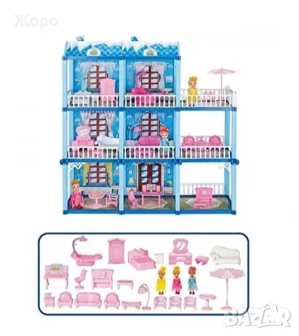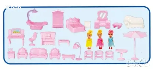 Много модерно обзавеждане за всяка стая (вана ,легло спалния ,тоалетка , канапе и обзавеждане за хол ,гардероб,нощни лампи, пияно , бюро за компютри , градински мебели ) които помага детето да познава мебелите и начина на подреждане и предназначение и да ги нарежда по различни конфигурации, занимателна игра за детето само с приятели или родители 3 кукли с височина 10 см