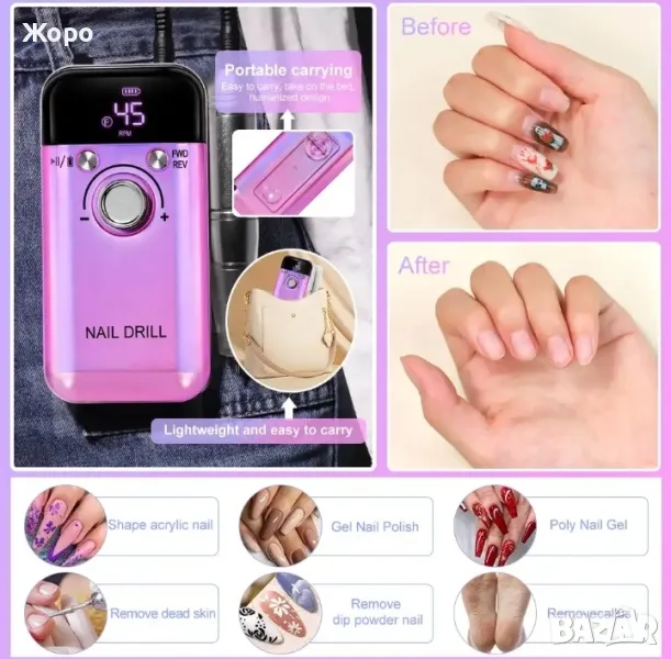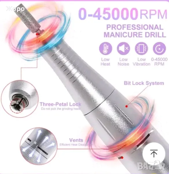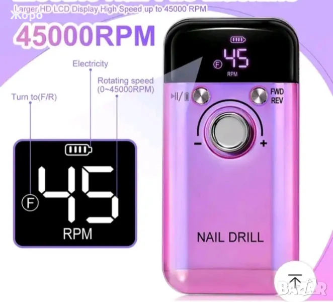 Максимална скорост 45000RPM: Акумулаторна пила за нокти, пълно зареждане 2 часа може да работи до 10 часа, скоростта може да се -регулира на 0-45000RPM, по-лесно и по-безопасно за начинаещи, максималната скорост е до 45000PRM със скорост бутон за управление, който е чудесен за акрилни нокти.
