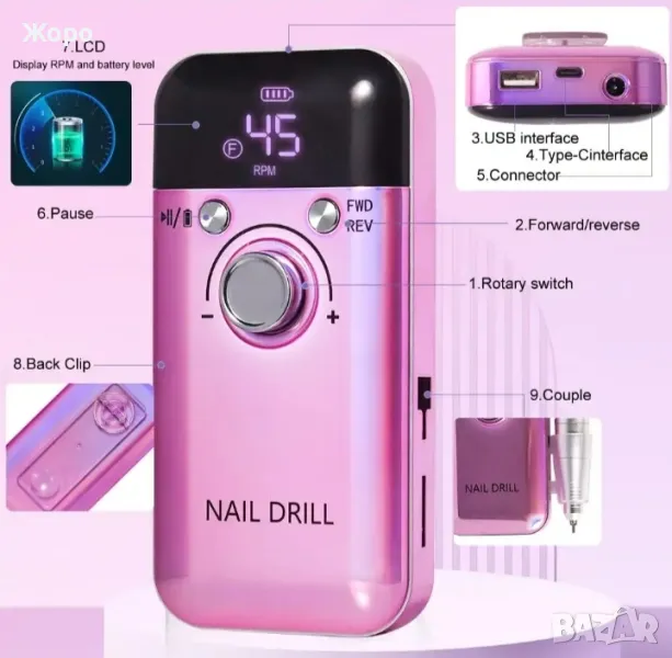Професионална преносима електрическа пила за нокти 45000 оборота тъмно или светло розова