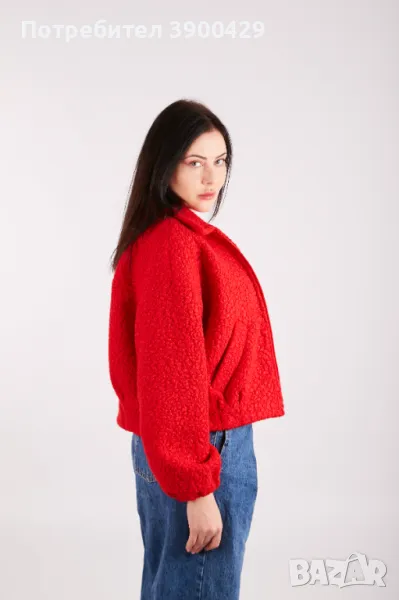 Открийте нашето вълнено дамско бомбър яке с модерен буфан ръкав, еластични маншети и странични джобове.
