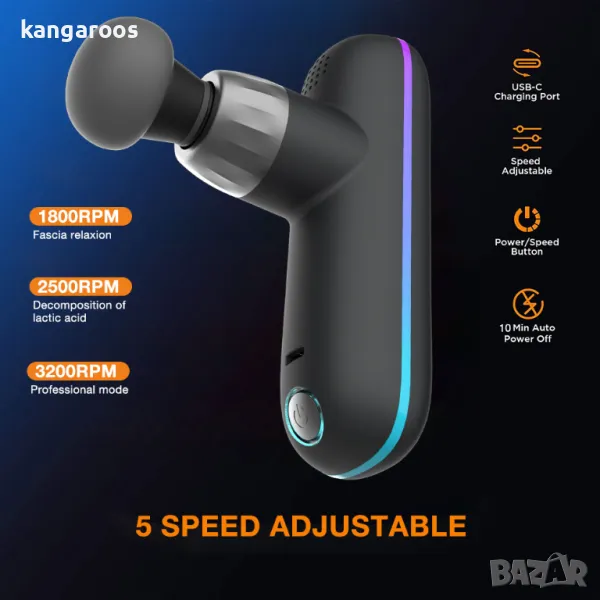 Мощен и тих електрически масажен пистолет: Оборудван със супер тих безчетков мотор с висок интензитет, този перкусионен мускулен масажор има 5 скорости (до 3200 оборота в минута), от които можете да избирате. Независимо дали предпочитате нежен масаж за релаксация или по-интензивен масаж за насочване към дълбоки мускулни възли, този мини масажен пистолет предлага гъвкавост за всички потребители.
