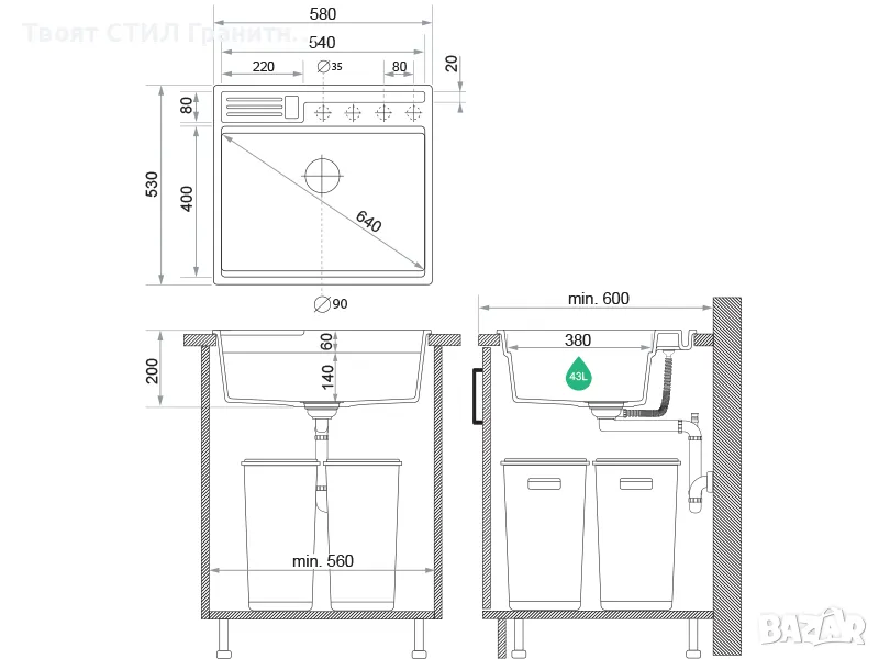 Продуктовите снимки показват предложената инсталация със сифони Твоят Стил. Преливникът и цедката, които се виждат на графиката, не са елементи от мивката и се продават отделно. За правилното монтиране на мивката е необходим персонализиран сифон с вертикален преливник.