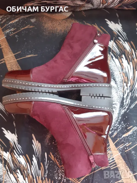 КОМПЛЕКТ СТИЛНИ ЧАННА И БОТИ В БОРДО.ПОЛЗВАНИ СА ВЕДНЪЖ ПО ПОВОД И СА КАТО НОВИ.БОТИТЕ СА размер 41 стелка-27см от велур и лачена кожа,КРАСИВИ,МЕКИ И УДОБНИ.ЧАНТАТА Е С МЕРКИ-ширина-35см,височина-29см,дълбочина-15см ОТ ИЗКУСТВЕНА КОЖА И ЛАЧЕНА КОЖА,МНОГО СТИЛНА,С ТРИ ОТДЕЛЕНИЯ,СРЕДНОТО ОТДЕЛЕНИЕ Е С ЦИП,ИМА И ДРУГ ДЖОБ С ЦИП И ОЩЕ ДВЕ ОТВОРЕНИ ДЖОБЧЕТА.ОТВЪН В ЗАДНАТА ЧАСТ ИМА ДЖОБ С ЦИП
