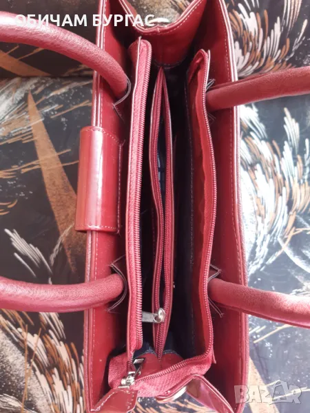 СТИЛНА ЧАНТА В БОРДО ОТ ИЗКУСТВЕНА КОЖА И ЛАЧЕНА КОЖА,използвана е само веднъж по повод, размери-ширина 35см,височина 29см,дълбочина 15см,ИМА ТРИ ВЪТРЕШНИ ОТДЕЛЕНИЯ КАТО СРЕДНОТО Е С ЦИП,ВЪТРЕ ИМА И МАЛЪК ДЖОБ С ЦИП И ОЩЕ ДВЕ ОТВОРЕНИ ДЖОБЧЕТА,ОТВЪН ОТЗАД ИМА ДЖОБ С ЦИП.ИМА КАТО ЧАНТАТА СЪЩИТЕ БОТИ 41РАЗМЕР-27см стелка-30лв