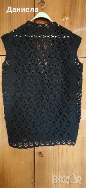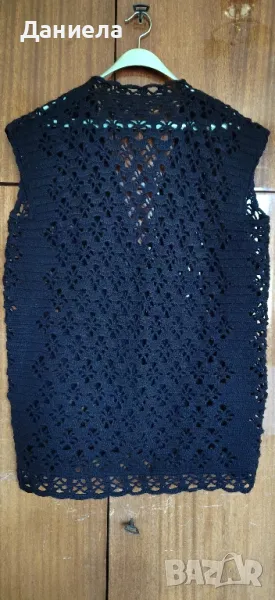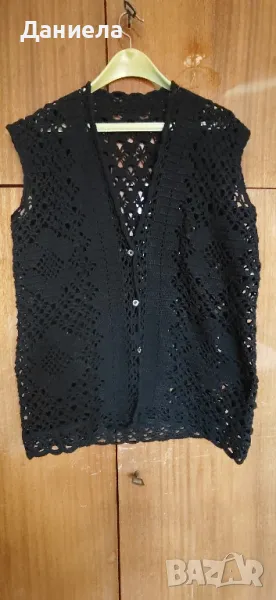 Красиво, ръчно плетено дамско елече на една кука, от вълнена черна прежда. Плетивото е с копчета отпред, много атрактивно и топло. Размери - дължина-80см. от рамо до рамо-54см. гръдна обиколка от 120-130см