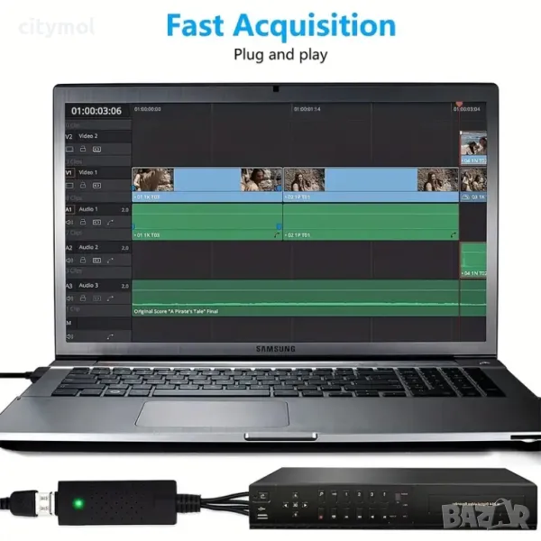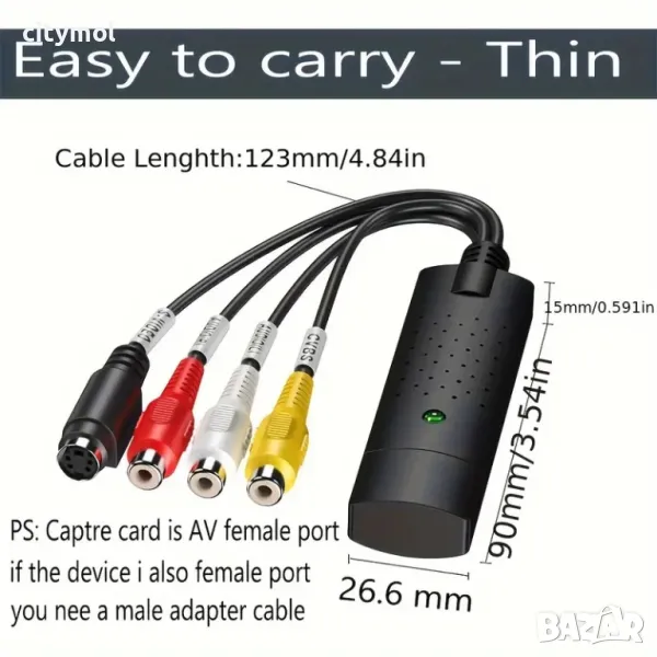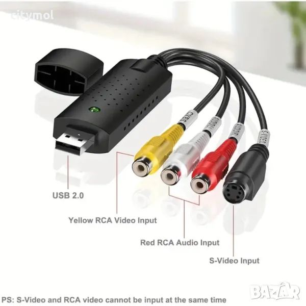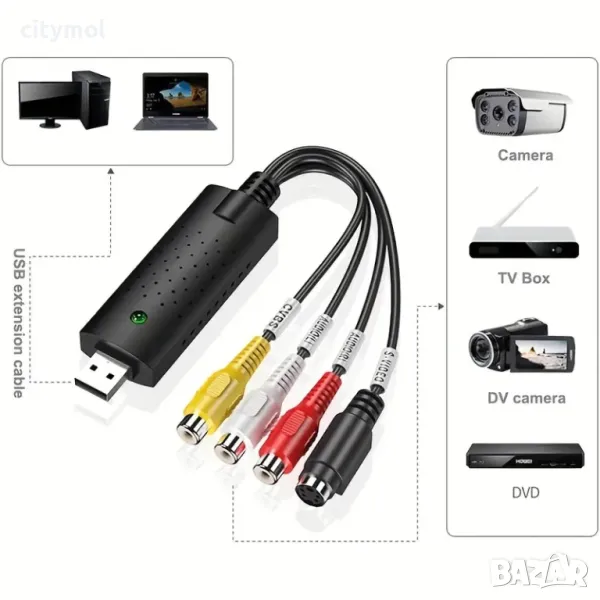 USB 2.0 адаптер за видео и аудио запис. Осигурява връзка между компютър и аудио/видео устройствa като VHS, VCR, DVD, TV, DV, видеокамери, фотоапарати, Game конзоли и др. през USB портовете на Вашият компютър/лаптоп.