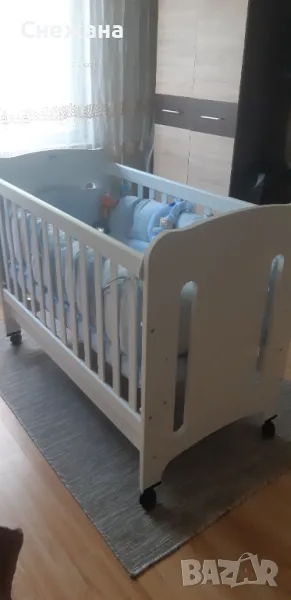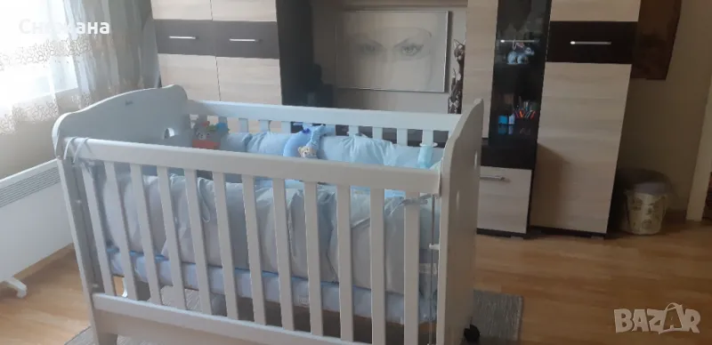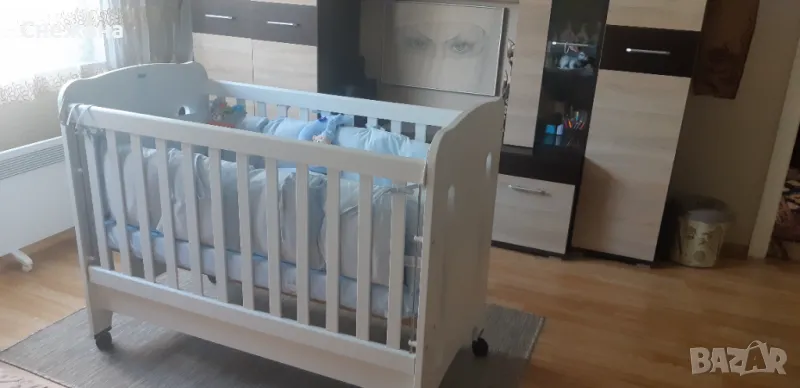 прекрасното легло. Размерите са много практични – 60/120 см вътрешни размери и 68/125см външни размери. Има 3 нива на матрака и е с подматрачна рамка.