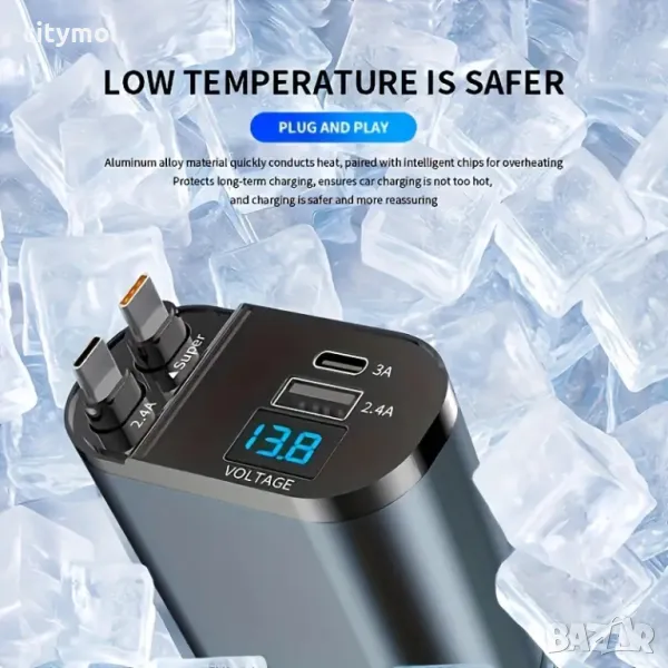 Зарядното има USB-C порт и USB порт, които могат безопасно да зареждат четири устройства едновременно. Двата изтеглящи се кабела са с дължина 70 см. Единия е за супер бързо зареждане, другия е макс. 2,4 А.