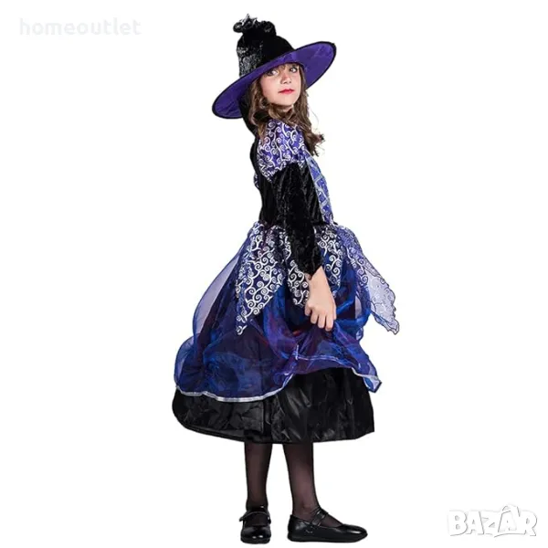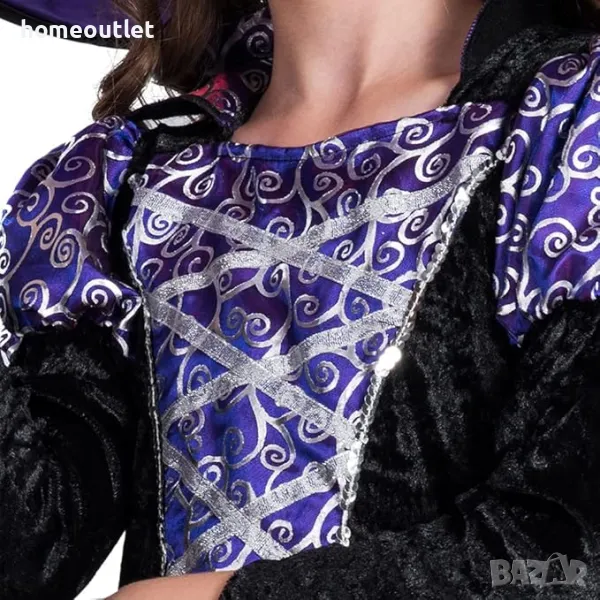 Маскараден костюм и шапка за вещица в черно и лилаво.