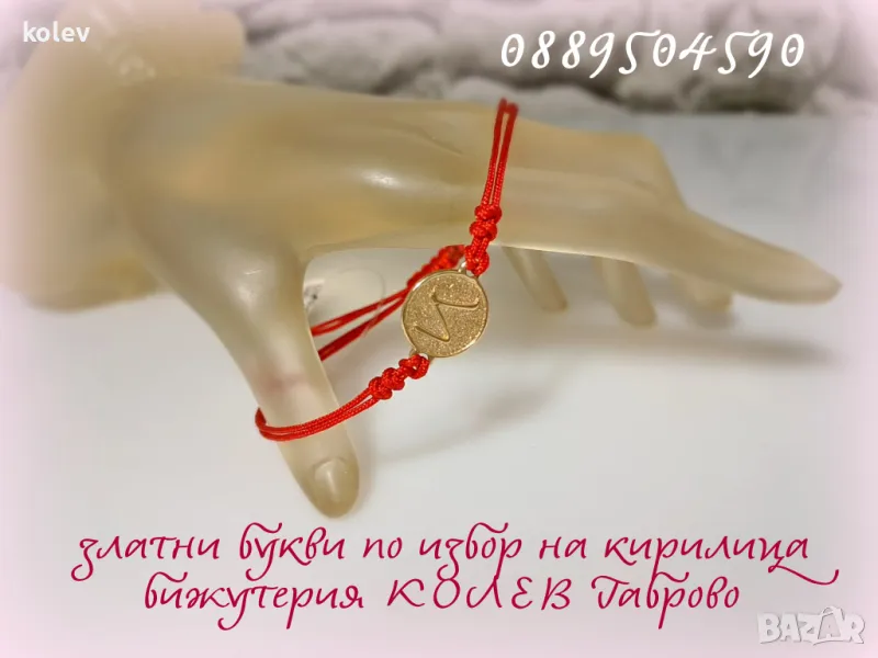 Златна буква на плочка на гривна червен конец, подходяща за всяка възраст