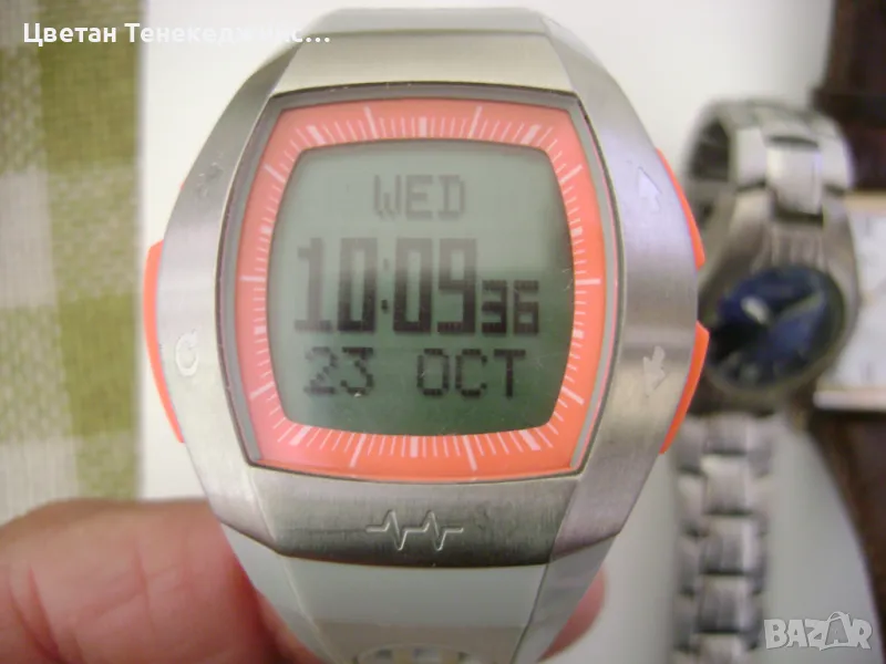 1.Кварцов часовник ТСМ.Работи точно.Аларма,таймер обратно броене,подсветка,пулсомер и други функции.Оригинална полимерна каишка.Ширина и височина-37мм.Водоустойчив 3 бара.-35лв