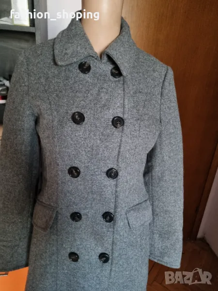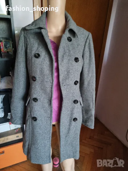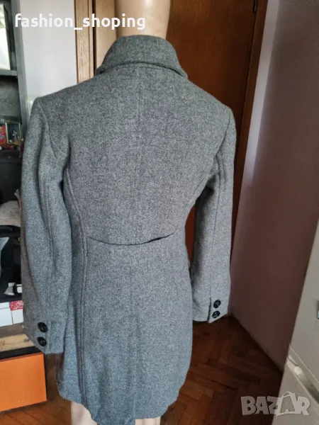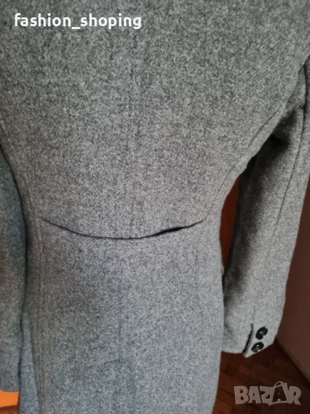 Палтото е вталено, двуредно закопчаване, външни капаци на джобовете, брандирана подплата.