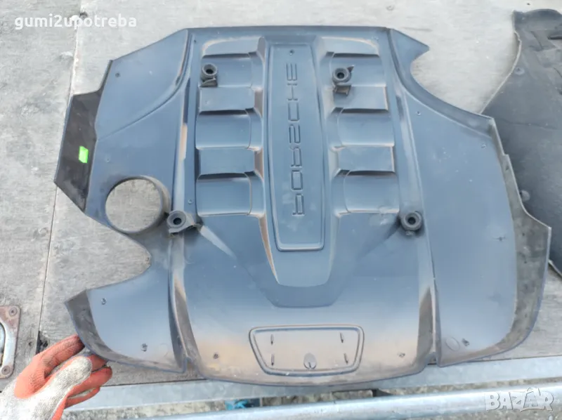 Продавам Употребяван Оригинален Декоративен Капак над Двигател 7PP.103.925.D за Porsche Cayenne 3.0D 92A/EG22/2012 Трите залавни места на тампоните са счупени-оградени са на снимката.Здрав и Работещ.Снимките са част от описанието.