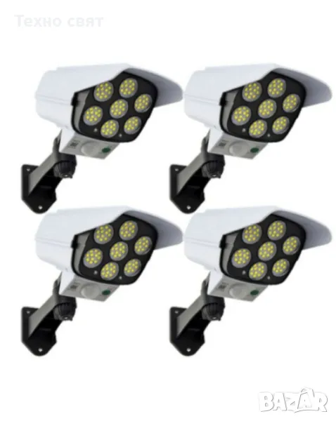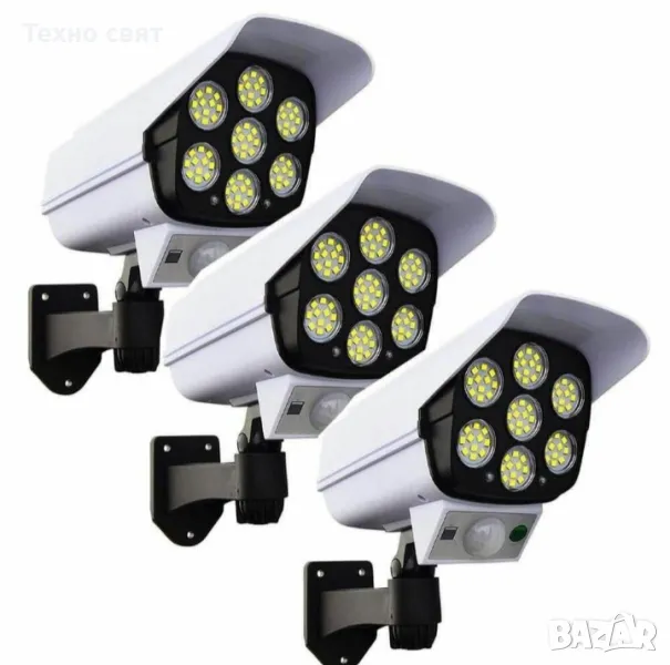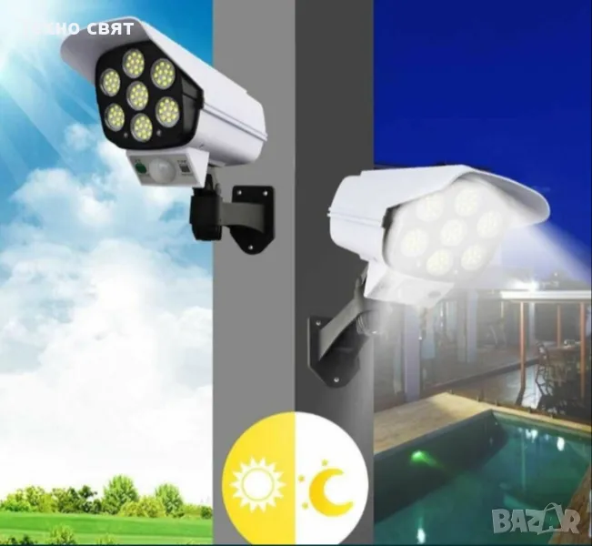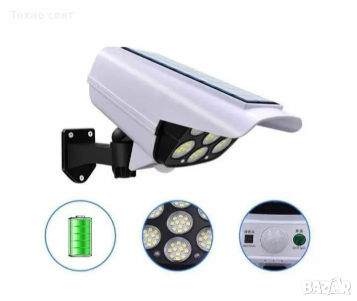 Със соларната лампа, имитираща камера за видеонаблюдение ще държите крадците далеч от имота ви. Продуктът има 77 ярки светодиода, активира се при движение, характеризира се с елегантен дизайн с нисък профил.