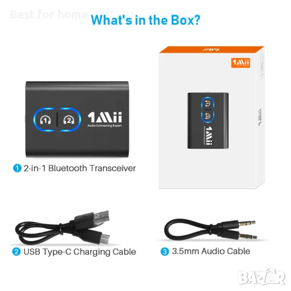 【ПРЕДАВАТЕЛ И ПРИЕМНИК 2-В-1】1Mii Bluetooth аудио предавател поддържа режим на предавател и приемник. В режим на предавател е много лесно да превърнете не-Bluetooth телевизор, компютър, фитнес/летателно оборудване в Bluetooth предавател. В режим на приемник чипът Bluetooth 5.3 осигурява висококачествен Bluetooth аудио сигнал за поточно предаване на музика към онези високоговорители или стереосистеми за кола/домашна среда, които нямат тази възможност.