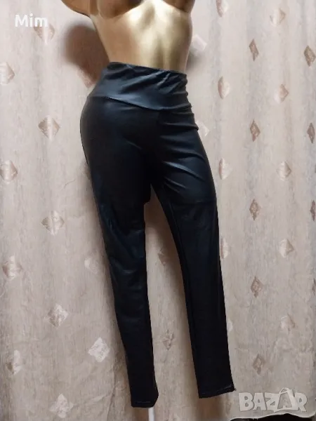 Черен еластичен клин от еко кожа, с висока талия, по етикет е S но предвид мерките в см е за по голям размер, талия от 40 до 50 см едностранно, ханш 50 до 65 см едностранно, дължина 98 см широчина на крачола от 12 до 29 см едностранно. Няма следи от употреба.