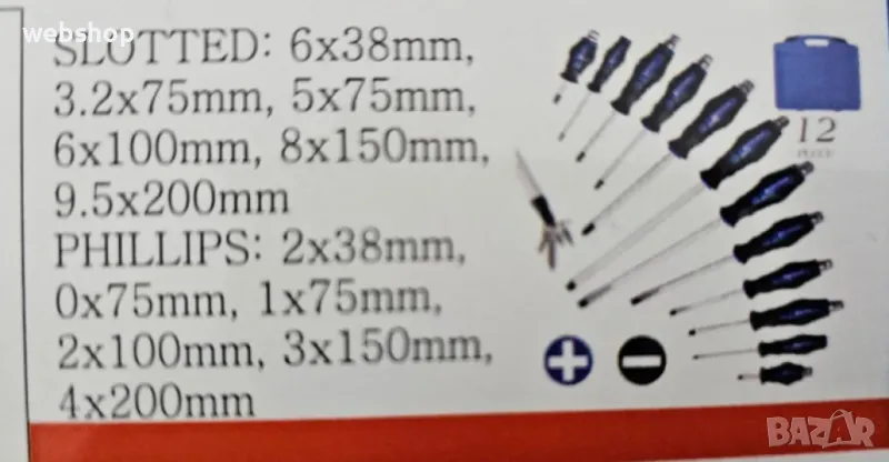 Кръстати отвертки: PH2x38mm, PH0x75mm, PH1x75mm, PH2x100mm, PH3x150mm, PH4x200mm;