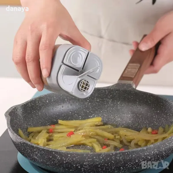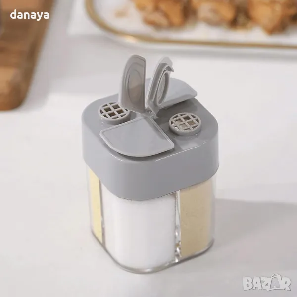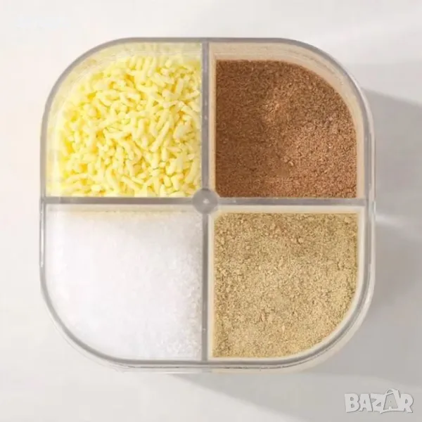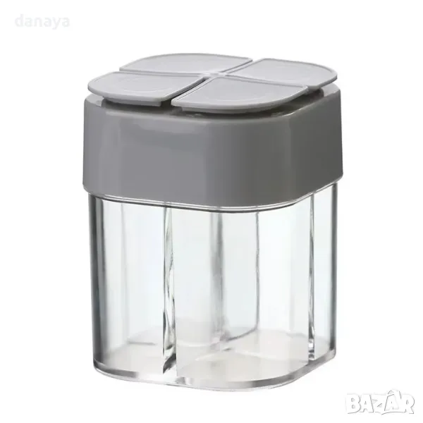 солничка, бурканче за подправки, 4 отделения, кухненски органайзер, пластмасова солничка, компактна солничка, кухненски аксесоар, бурканче за съхранение, солница с отделения, практична солничка, кухненски съд, контейнер за подправки, пластмасов контейнер, подредба на кухнята, буркан за подправки