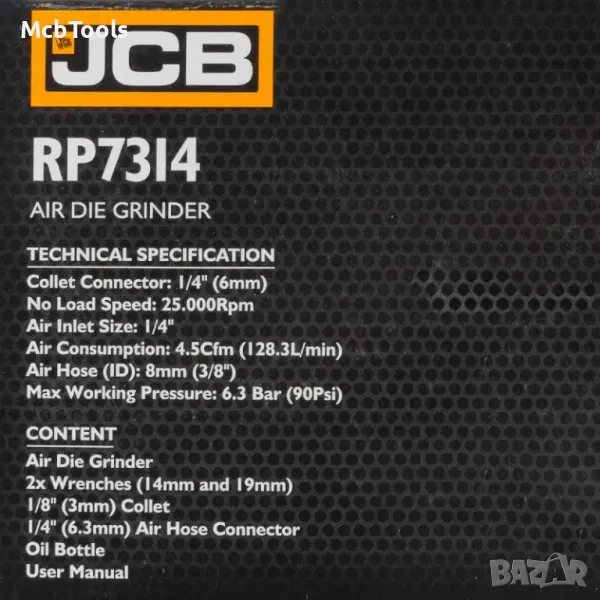 Пневматична права шлифовалка JCB RP7314 е с работно налягане 6.3 бара и отвор на цангата 3мм и 6мм. Подходяща е за продължителна работа заради изключително компактните си размери и форма.