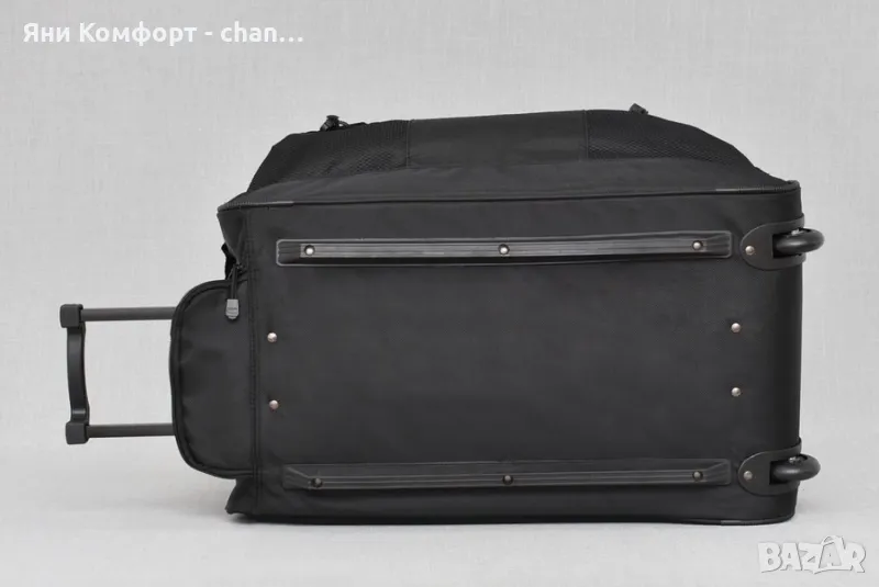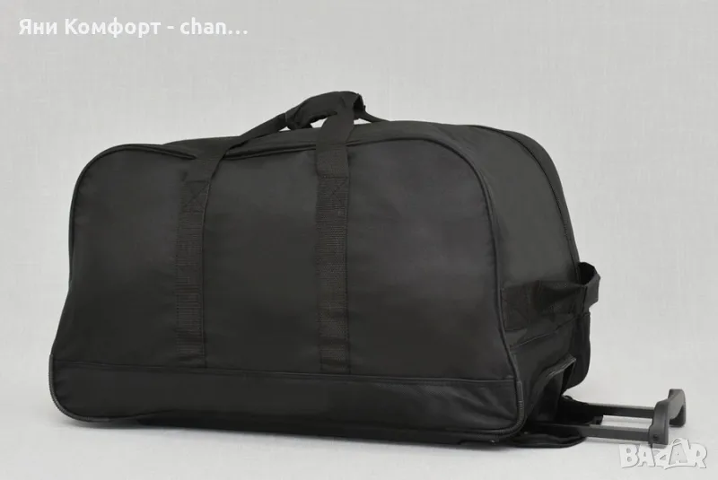 - здрав и удобен- две колела и теглич- здрави ципове- основно отделение- затваря се с двупосочен цип- голям лицев джоб вътре с четири малки джобчета- два лицеви джоба с мрежа и един с цип- две дръжки за ръка- странична дръжка за ръка- две шини отдолу за здравинаРазмер: 64 х 36 х 35 см.
