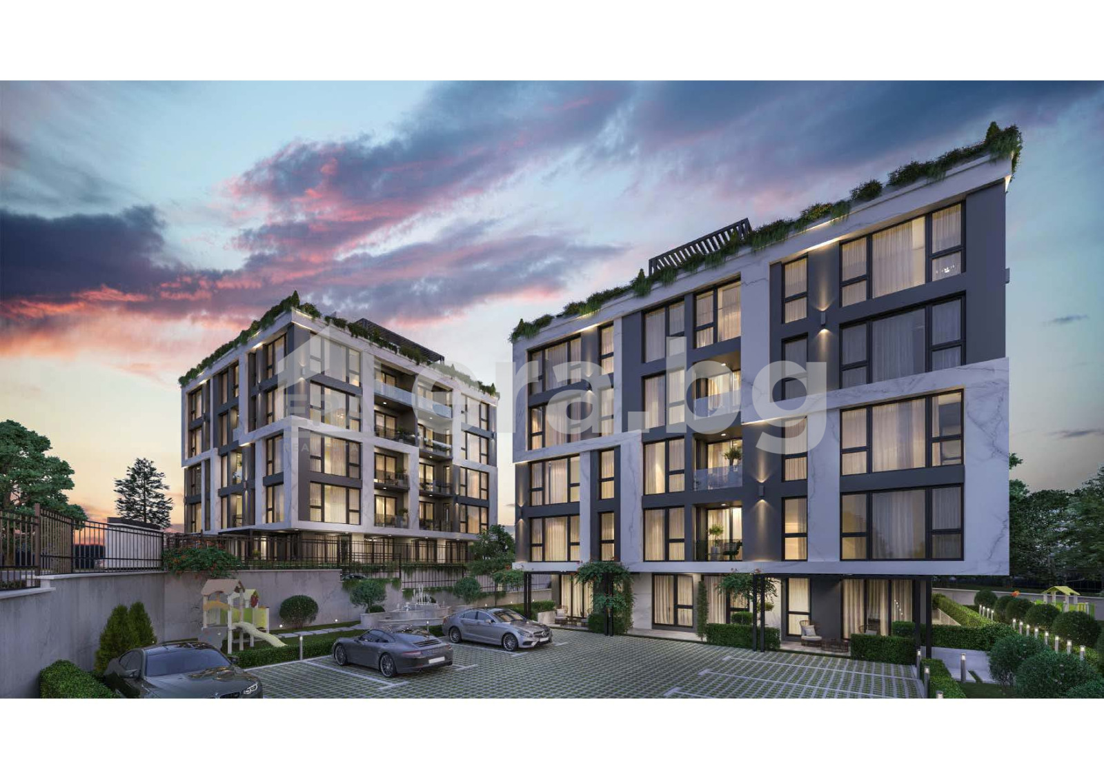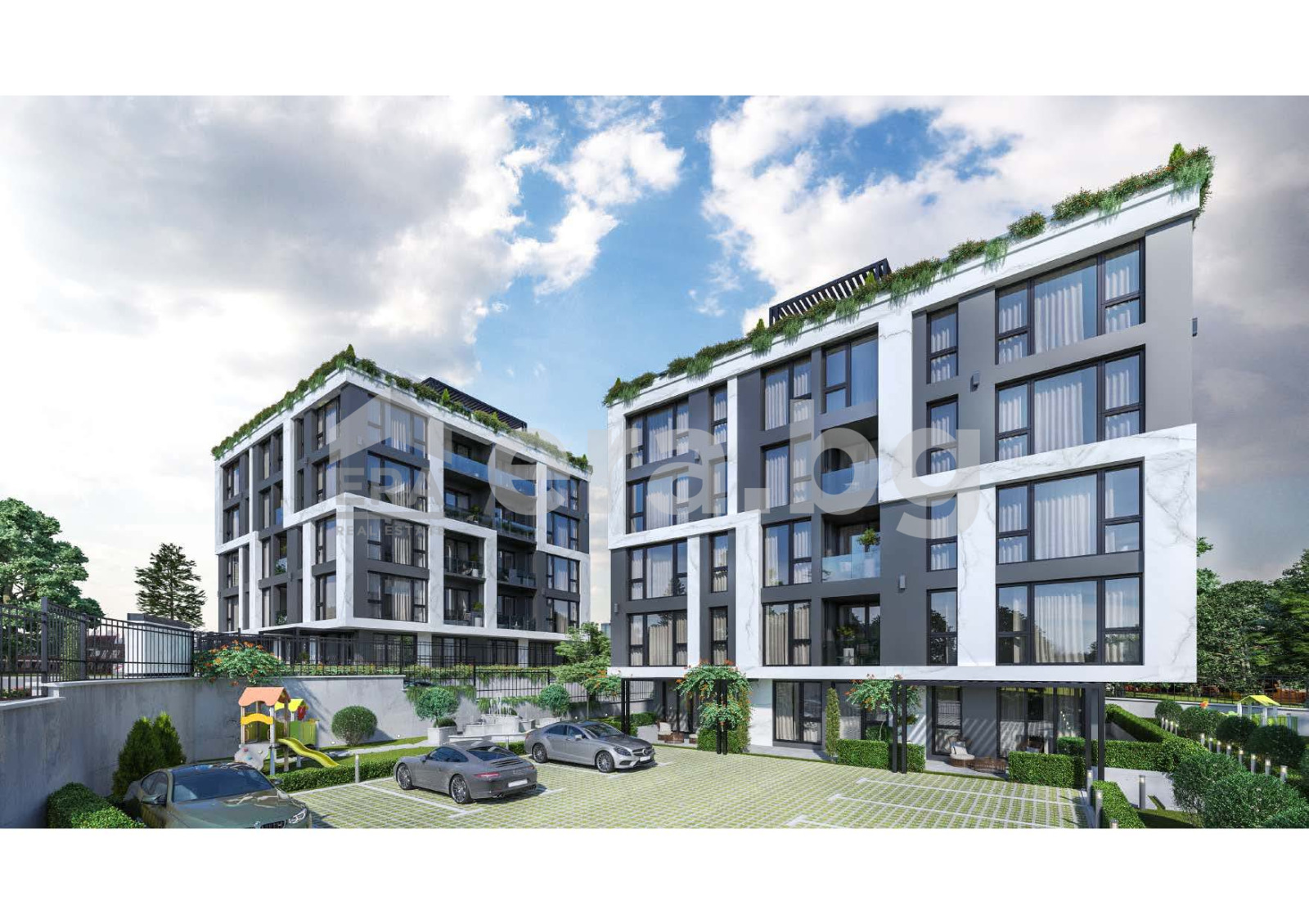 Комплексът включва две 6-етажни жилищни сгради, състоящи се от 8 студия и 36 апартамента с една и две спални, свързани от двор, с обмислено озеленяване, детска площадка и места за сядане на открито. Към всеки апартамент имате възможност да закупите и паркомясто на открития или подземния паркинг.