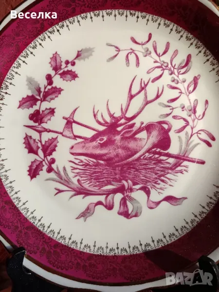 🇫🇷 Френска порцеланова чиния с 24 карата злато и ловни мотиви. Тази прекрасна порцеланова картина на елен е в червен бургудни цвят на фона на снежно бял порцелан. Маркировка, 24 см диаметър, без драскотина, в отлично състояние като нова. Предвид перфектното състояние е чудесен подарък за ловец или колекционер.