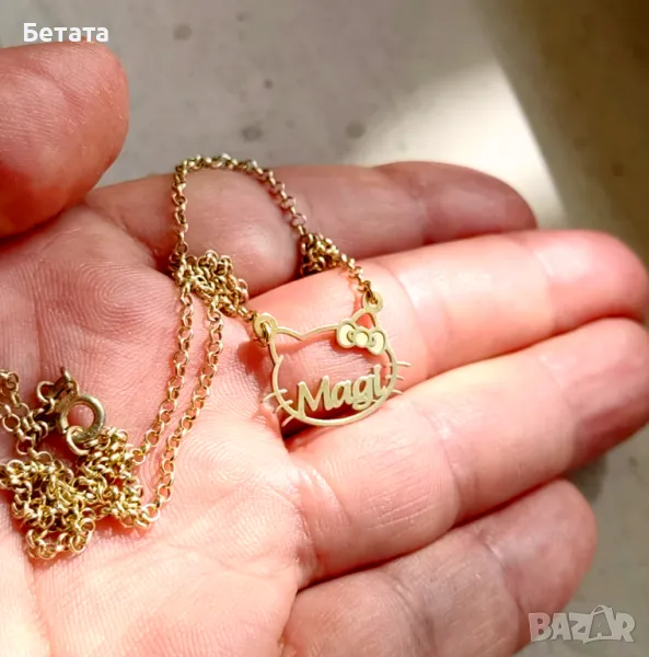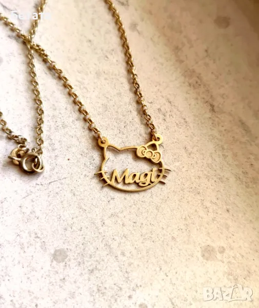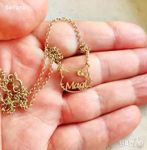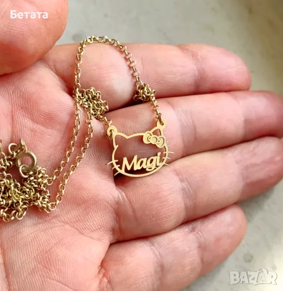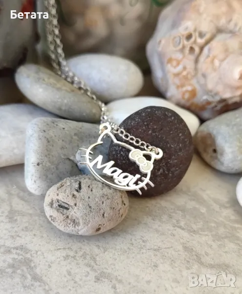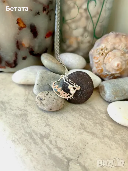 Висулката е допълнително персонализирана с името на любимия човек, което придава уникален и личен характер на бижуто. Името е изписано със стилен шрифт, който хармонично се вписва в цялостния дизайн на висулката.