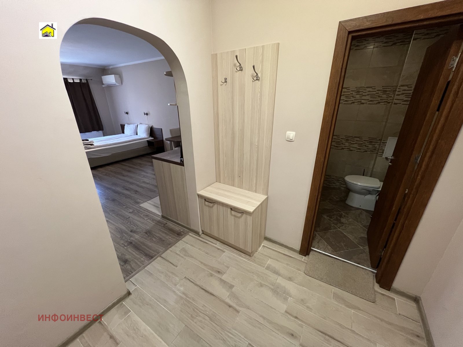 Намира се на втори етаж и се състои от вх.антре, стая с кухненски бокс, баня с тоалетна и балкон. Отоплението е с климатик.
