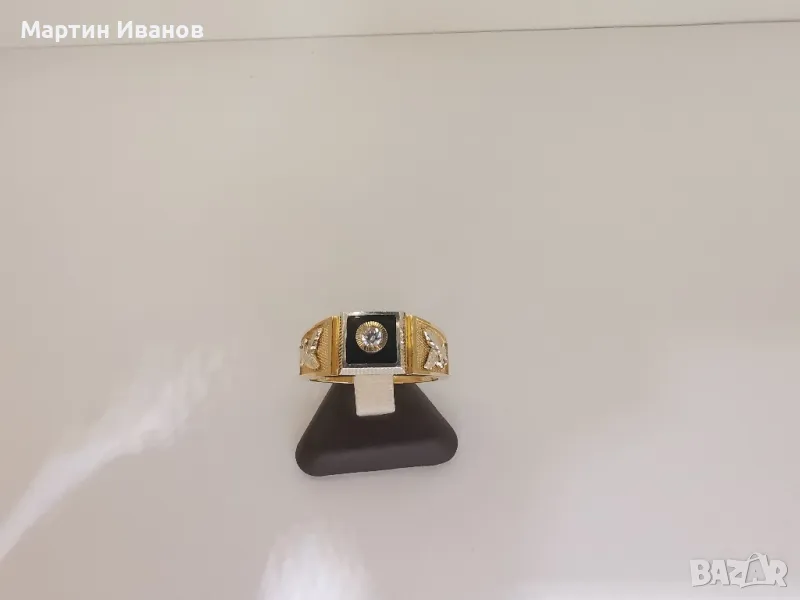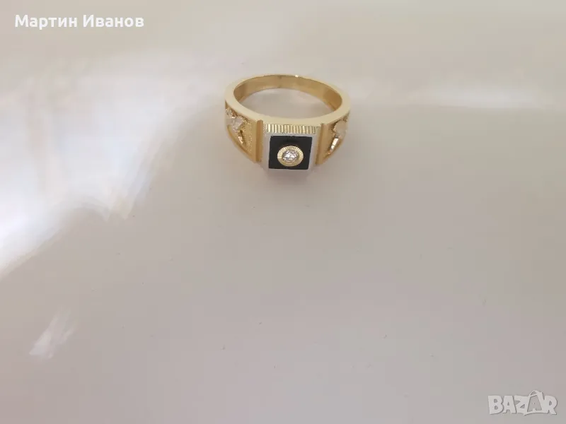 Златен пръстен с Черна плочка и бял циркон, 14к, 585пр, 6.37гр, вътрешен диаметър 20мм, размер 64 мярка