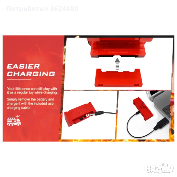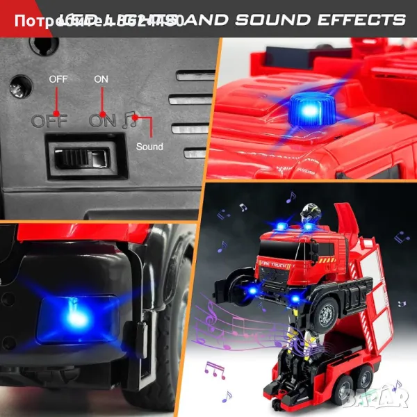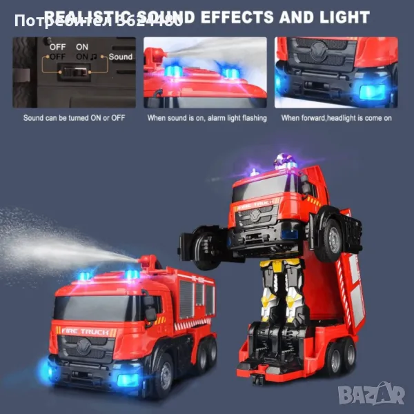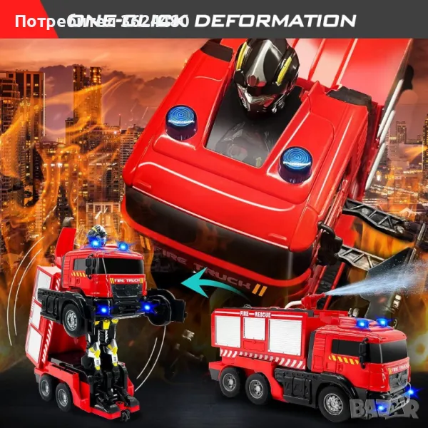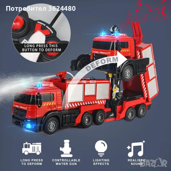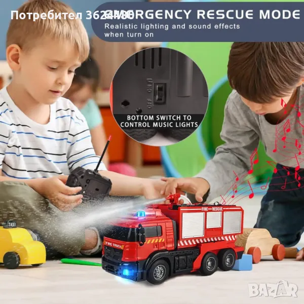 Пожарникарска кола играчка с водно оръдие, лед светлини, звукова сигнализация, акумулаторна батерия и дистанционно управление