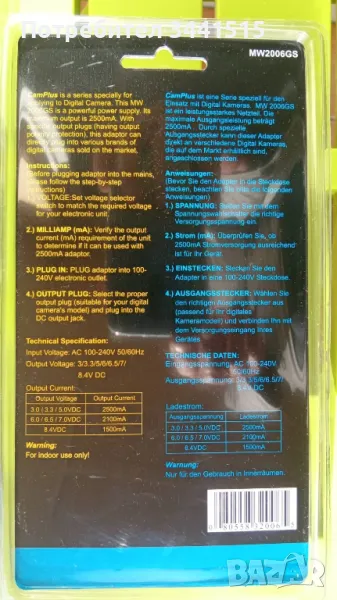 Захранващ адаптор за цифрови фотоапарати MW 2006CamPlus 2500mA, 3.0V, 3.3V, 5.0V, 6.0V, 6.5V, 7.0V, 8.4V
